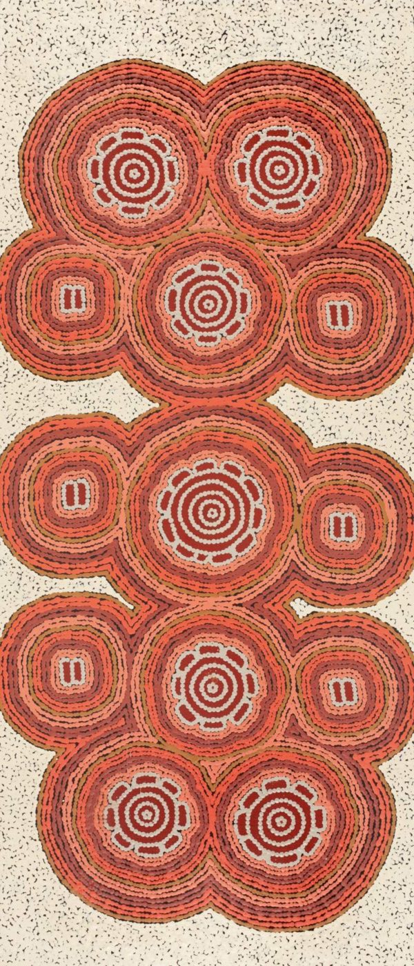 This painting depicts the Pamapardu Jukurrpa (Flying Ant Dreaming) from Warntungurru, west of Yuendumu. ‘Pamapardu’ is the Warlpiri name for the flying ants or termites that build the large anthills found throughout Warlpiri country. This country belongs to Nakamarra/Napurrurla women and Jakamarra/Jupurrurla men. ‘Pamapardu’ are flying ants. They build earth mounds (‘mingkirri’) that are common in the Tanami area. When heavy rains come in summer the ‘mingkirri’ get flooded out, so the ‘pamapardu’ grow wings and fly off to make new homes, following their queens to dry mounds or to build a new. When they have found their new home they drop their wings. In this stage they can be collected, lightly cooked in coals and eaten. As they fall to the ground women collect them to eat because they are nice and sweet. In contemporary Warlpiri paintings traditional iconography is used to represent the Jukurrpa, particular sites and other elements. When this Jukurrpa story is painted concentric circles are used to represent the ‘mingkirri’ and the rockholes involved in the story, including the central one at Wapurtali (Mt Singleton). Dashes are often depicted around the circles to represent the ‘pamapardu’.