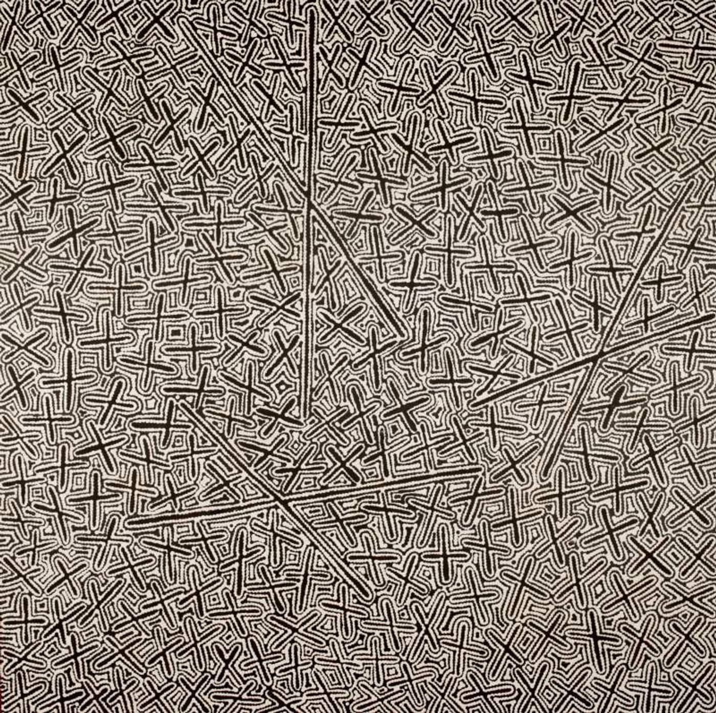 The Jukurrpa site shown in this painting for Ngatijirri (budgerigar [Melopsittacus undulates]) is at Yangarnmpi, south of Yuendumu. ‘Ngatijirri’ are small, bright green birds native to central Australia which are common around the Yuendumu area, especially after the summer rains. Men would hunt for ‘ngatijirri’ nests, robbing them of eggs and juvenile birds, which are both considered delicacies. The men would also go out hunting for adult, flying ‘ngatijirri’, which they would kill by swinging branches, killing sticks or ‘karli’ (boomerangs) to hit the birds in flight. The ‘ngatijirri’ travelled to Yangarnmpi from Patirlirri, near Willowra to the east of Yuendumu and travelled further on to Marngangi, north/west of Mount Dennison and west of Yuendumu. Each time the flock of ancestral ‘ngatijirri’ lands, they perform ceremonies, singing and dancing as they fly and roost in the trees. The sites of these ceremonies are depicted in this painting as concentric circles, while cross-like shapes depict the footprints of the birds on the ground and give an indication of the large flocks of ‘ngatijirri’ that can be found near Yangarnmpi and other sites close to Yuendumu. After good rains ‘ngatijirri’ can successfully breed several times, resulting in an explosion of the population in a short time. Custodians for the Ngatijirri Jukurrpa are Napaljarri/Nungarrayi women and Japaljarri/Jungarrayi men.