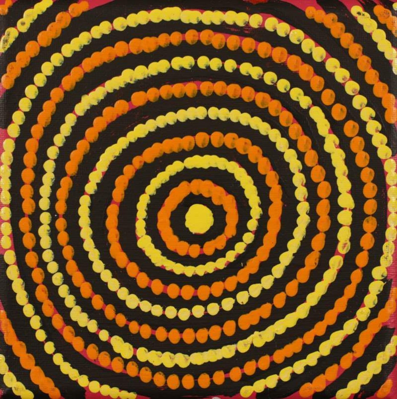 The Napaljarri-warnu Jukurrpa (seven sisters Dreaming) depicts the story of the seven ancestral Napaljarri sisters who are found in the night sky today in the cluster of seven stars in the constellation Taurus, more commonly known as the Pleiades. The Pleiades are seven women of the Napaljarri skin group and are often depicted in paintings of this Jukurrpa carrying the Jampijinpa man ‘wardilyka’ (the bush turkey [Ardeotis australias]) who is in love with the Napaljarri-warnu and who represents the Orion’s Belt cluster of stars. Jukurra-jukurra, the morning star, is a Jakamarra man who is also in love with the seven Napaljarri sisters and is often shown chasing them across the night sky. In a final attempt to escape from the Jakamarra the Napaljarri-warnu turned themselves into fire and ascended to the heavens to become stars. The custodians of the Napaljarri-warnu Jukurrpa are Japaljarri/Jungarrayi men and Napaljarri/Nungarrayi women. Some parts of the Napaljarri-warnu Jukurrpa are closely associated with men’s sacred ceremonies of a very secretive nature. In contemporary Warlpiri paintings traditional iconography is used to represent the Jukurrpa, associated sites and other elements. Often depicted in paintings for this Jukurrpa is the female star Yantarlarangi (Venus – the Evening Star) who chases the seven Napaljarri sisters for having stolen the night from her.