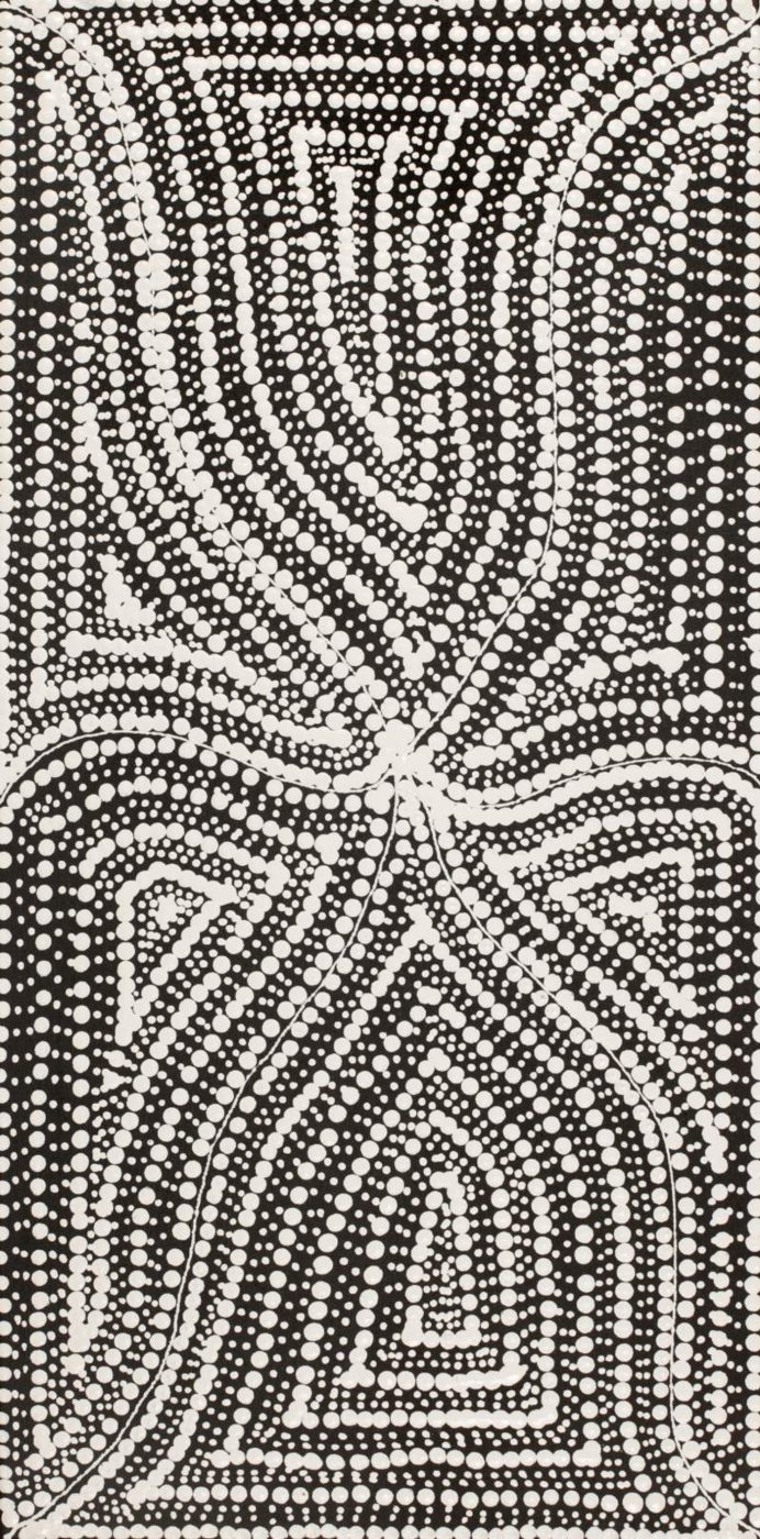 This painting tells the story of a Jangala ‘watiya-warnu’ (Acacia tenuissima) ancestor who travelled south from a small hill called Ngurlupurranyangu to Yamunturrngu (Mount Liebig). As he travelled he picked the ‘watiya-warnu’ seeds and placed them in ‘parrajas’ (food carriers), one of which he carried on his head. Watiya-warnu is a seed bearing tree that grows in open spinifex or mulga country. When people returned to their camp after collecting the seeds they would make large windbreaks for shelter and winnow the seed in the late afternoon. Immature ‘watiya-warnu’ seed is ground into a paste and can be used to treat upset stomachs. The associated ‘watiya-warnu’ ceremony involves the preparation of a large ground painting. This Jukurrpa belongs to Nampijinpa/Nangala women and Jampijinpa/Jangala men. In contemporary Warlpiri paintings traditional iconography is used to represent the Jukurrpa, particular sites and other elements. In paintings of this Dreaming ‘U’ shapes are often depicting women collecting the ‘watiya-warnu’ seeds. Oval shapes represent the ‘parrajas’ where they carry the seeds and strait lines beside them frequently portrait digging sticks.