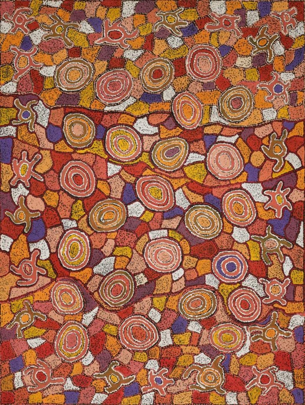 The site for this Dreaming is Yumari, a collection of rocks west of Kintore in the Gibson Desert. Yumari is the site of a forbidden love union between a Japaljarri man and a Nangala woman. This Dreaming was passed down to the artist by a Pintupi man. In contemporary Warlpiri paintings traditional iconography is used to represent the Jukurrpa, associated sites and other elements. In this work concentric circles are often used to represent ‘warnirri’ (rock holes).