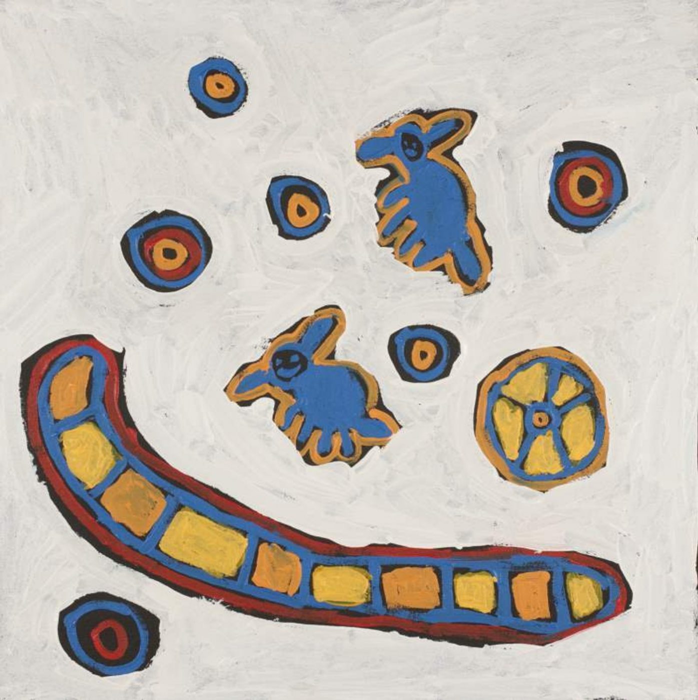This Jukurrpa contains important information about the different roles that men and women play in Warlpiri culture, particularly in the context of ritual performance. It alludes to an earlier time in which their ritual and social roles were reversed, in which women controlled the sacred objects and weapons that are now exclusively “owned” by men.