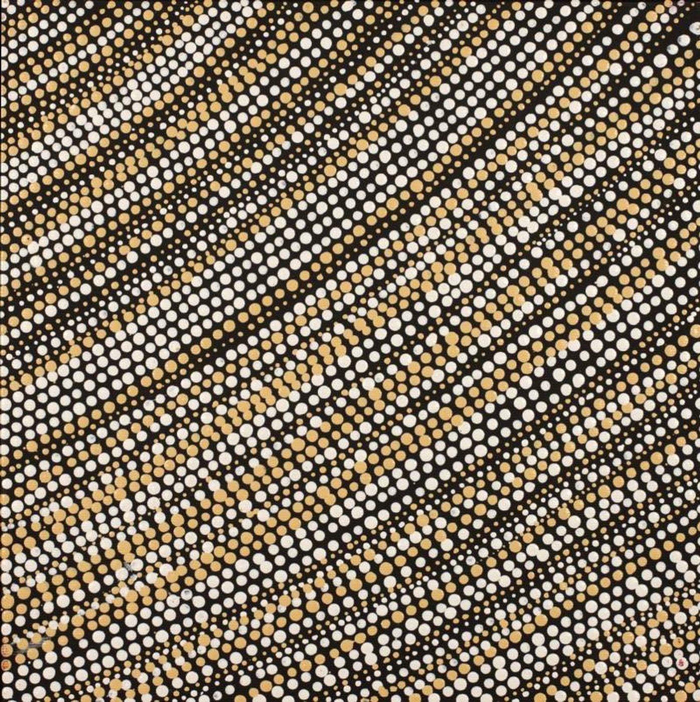 The ‘kirda’ (owners) of this country are Napangardi/Napanangka women and Japangardi/Japanangka men, who can depict portions of the Mina Mina Jukurrpa in their paintings. There are a number of different components of the Mina Mina Jukurrpa; artists usually choose to depict one particular aspect. These can include ‘karnta’ (women), ‘karlangu’ (digging sticks), ‘majardi’ (hairstring skirts/tassels), ‘ngalyipi’ (snakevine [Tinospora smilacina]), ‘jintiparnta’ (desert truffle [Elderia arenivaga]), and ‘kurrkara’ (desert oak [Allocasuarina decaisneana]).