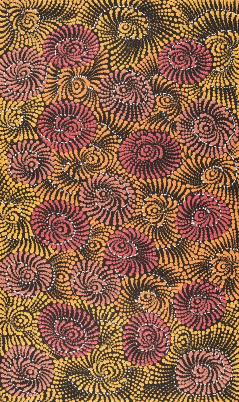This painting depicts the Pamapardu Jukurrpa (Flying Ant Dreaming) from Warntungurru, west of Yuendumu. ‘Pamapardu’ is the Warlpiri name for the flying ants or termites that build the large anthills found throughout Warlpiri country. This country belongs to Nakamarra/Napurrurla women and Jakamarra/Jupurrurla men. ‘Pamapardu’ are flying ants. They build earth mounds (‘mingkirri’) that are common in the Tanami area. When heavy rains come in summer the ‘mingkirri’ get flooded out, so the ‘pamapardu’ grow wings and fly off to make new homes, following their queens to dry mounds or to build a new. When they have found their new home they drop their wings. In this stage they can be collected, lightly cooked in coals and eaten. As they fall to the ground women collect them to eat because they are nice and sweet. In contemporary Warlpiri paintings traditional iconography is used to represent the Jukurrpa, particular sites and other elements. When this Jukurrpa story is painted concentric circles are used to represent the ‘mingkirri’ and the rockholes involved in the story, including the central one at Wapurtali (Mt Singleton). Dashes are often depicted around the circles to represent the ‘pamapardu’.