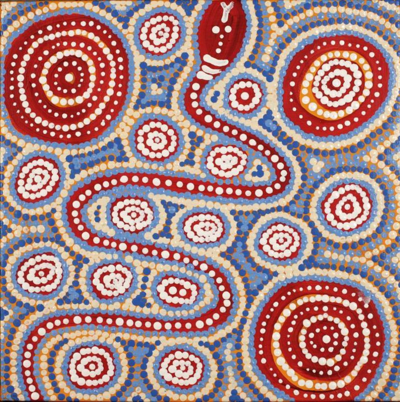 The place depicted in this painting, Ngama, is located south of Yuendumu in the Northern Territory. This Dreaming belongs to Nakamarra/Napurrurla women and Jakamarra/Jupurrurla men. This story describes the journey of Yarripiri, an ancestral ‘warna’ (snake). He travelled from Wirnparrku near Mt. Liebig to Yimparlu, and continued its way through the territories of Ngapanangka-jarra, Warlajirryi, Kurnmundu, Yinyirrinyi on to Ngama. Later Yarripiri travelled further north via Mijirlparnta (Mission Creek) and right through to the top end of Australia.Yarripiri was very sad as his family had left him behind at Wirnparrku. He was blind and crippled but he was determined to follow and search them out. He had to be carried. This was the job undertaken by the ‘kurdungurlu’ (ceremonial police) of the Dreaming: the Nangala/Nampijinpa women and Jangala/Jampijinpa men. Where Yarripiri’s tail slumped and touched the ground creeks were formed, such as Mijirlparnta, west of Yuendumu. Yarripiri tracks and paths are often represented by arc shapes or curved lines depicted across the canvas.