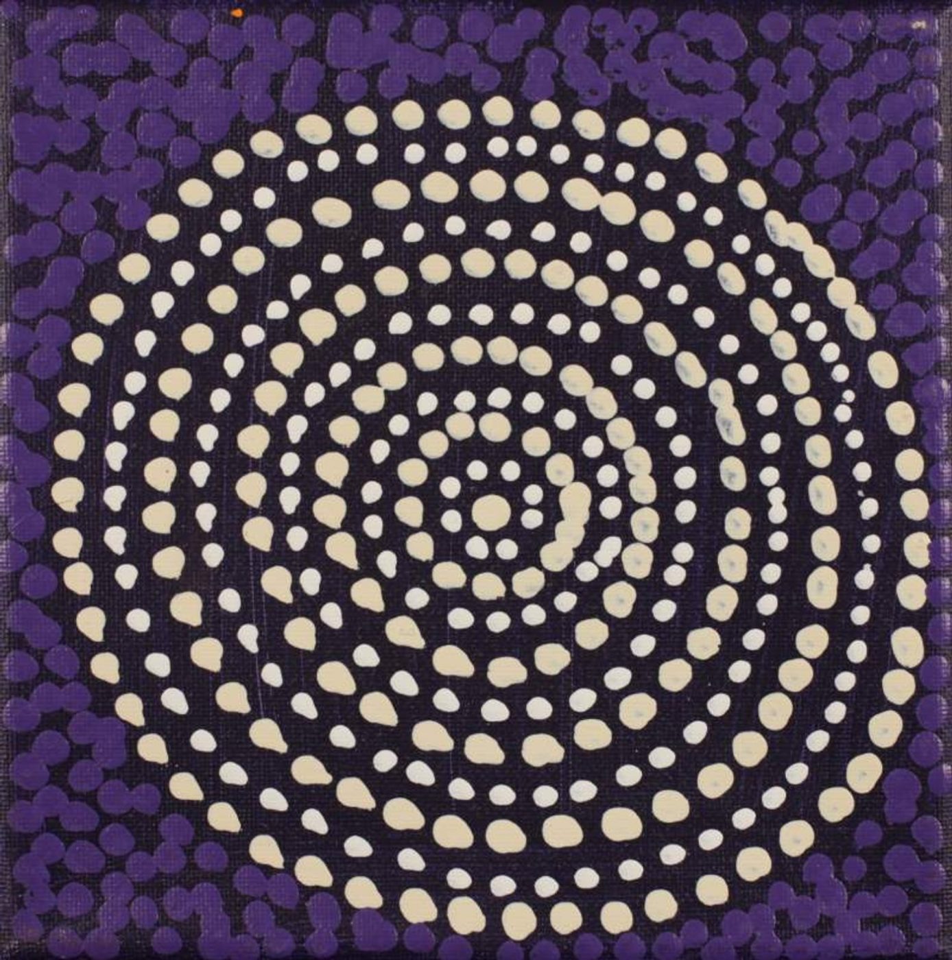 The Napaljarri-warnu Jukurrpa (seven sisters Dreaming) depicts the story of the seven ancestral Napaljarri sisters who are found in the night sky today in the cluster of seven stars in the constellation Taurus, more commonly known as the Pleiades. The Pleiades are seven women of the Napaljarri skin group and are often depicted in paintings of this Jukurrpa carrying the Jampijinpa man ‘wardilyka’ (the bush turkey [Ardeotis australias]) who is in love with the Napaljarri-warnu and who represents the Orion’s Belt cluster of stars. Jukurra-jukurra, the morning star, is a Jakamarra man who is also in love with the seven Napaljarri sisters and is often shown chasing them across the night sky. In a final attempt to escape from the Jakamarra the Napaljarri-warnu turned themselves into fire and ascended to the heavens to become stars. The custodians of the Napaljarri-warnu Jukurrpa are Japaljarri/Jungarrayi men and Napaljarri/Nungarrayi women. Some parts of the Napaljarri-warnu Jukurrpa are closely associated with men’s sacred ceremonies of a very secretive nature. In contemporary Warlpiri paintings traditional iconography is used to represent the Jukurrpa, associated sites and other elements. Often depicted in paintings for this Jukurrpa is the female star Yantarlarangi (Venus – the Evening Star) who chases the seven Napaljarri sisters for having stolen the night from her.
