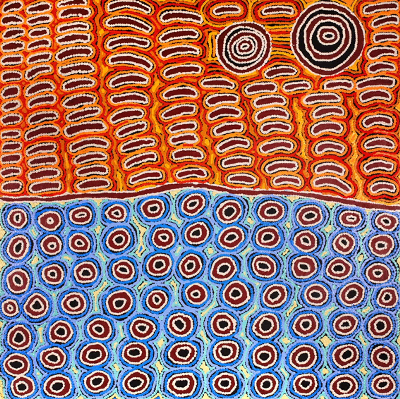 The subject of this work is Lappi Lappi, a rock hole near Lake Hazlett, about 90 km northwest of Lake Mackay in Western Australia. The country belongs to Nampijinpa/Jampijinpa and Nangala/Jangala skin groups. Located in a sheltered basin, the rock hole at Lappi Lappi is a permanent source of water, and is surrounded by country rich in bush tucker. In the time of the Jukurrpa (Dreamtime) many mothers with young children would gather there because it was a safe place to stay. The rock hole at Lappi Lappi is home to a ‘warnayarra’, a rainbow serpent that travels underground between various rock holes. One day, women were gathered at the rock hole with their children, singing and dancing. When the ‘warnayarra’ heard the sound of voices, it travelled silently towards them, under the water. When it reached the edge of the rock hole, it rose out of the water and ate them all.