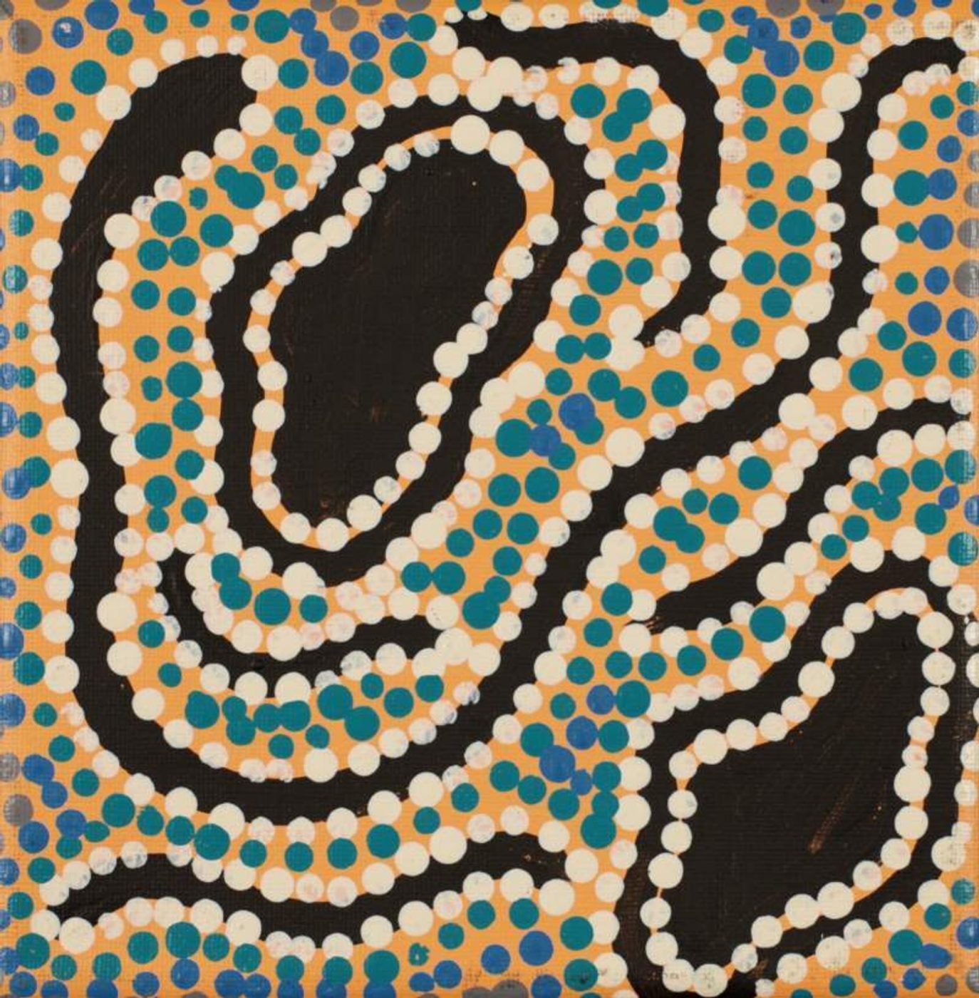 The place depicted in this painting, Ngama, is located south of Yuendumu in the Northern Territory. This Dreaming belongs to Nakamarra/Napurrurla women and Jakamarra/Jupurrurla men. This story describes the journey of Yarripiri, an ancestral ‘warna’ (snake). He travelled from Wirnparrku near Mt. Liebig to Yimparlu, and continued its way through the territories of Ngapanangka-jarra, Warlajirryi, Kurnmundu, Yinyirrinyi on to Ngama. Later Yarripiri travelled further north via Mijirlparnta (Mission Creek) and right through to the top end of Australia.Yarripiri was very sad as his family had left him behind at Wirnparrku. He was blind and crippled but he was determined to follow and search them out. He had to be carried. This was the job undertaken by the ‘kurdungurlu’ (ceremonial police) of the Dreaming: the Nangala/Nampijinpa women and Jangala/Jampijinpa men. Where Yarripiri’s tail slumped and touched the ground creeks were formed, such as Mijirlparnta, west of Yuendumu. Yarripiri tracks and paths are often represented by arc shapes or curved lines depicted across the canvas.