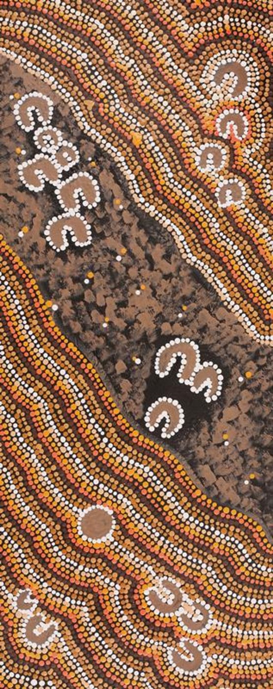 The subject of this work is Lappi Lappi, a rock hole near Lake Hazlett, about 90 km northwest of Lake Mackay in Western Australia. The country belongs to Nampijinpa/Jampijinpa and Nangala/Jangala skin groups. Located in a sheltered basin, the rock hole at Lappi Lappi is a permanent source of water, and is surrounded by country rich in bush tucker. In the time of the Jukurrpa (Dreamtime) many mothers with young children would gather there because it was a safe place to stay. The rock hole at Lappi Lappi is home to a ‘warnayarra’, a rainbow serpent that travels underground between various rock holes. One day, women were gathered at the rock hole with their children, singing and dancing. When the ‘warnayarra’ heard the sound of voices, it travelled silently towards them, under the water. When it reached the edge of the rock hole, it rose out of the water and ate them all.