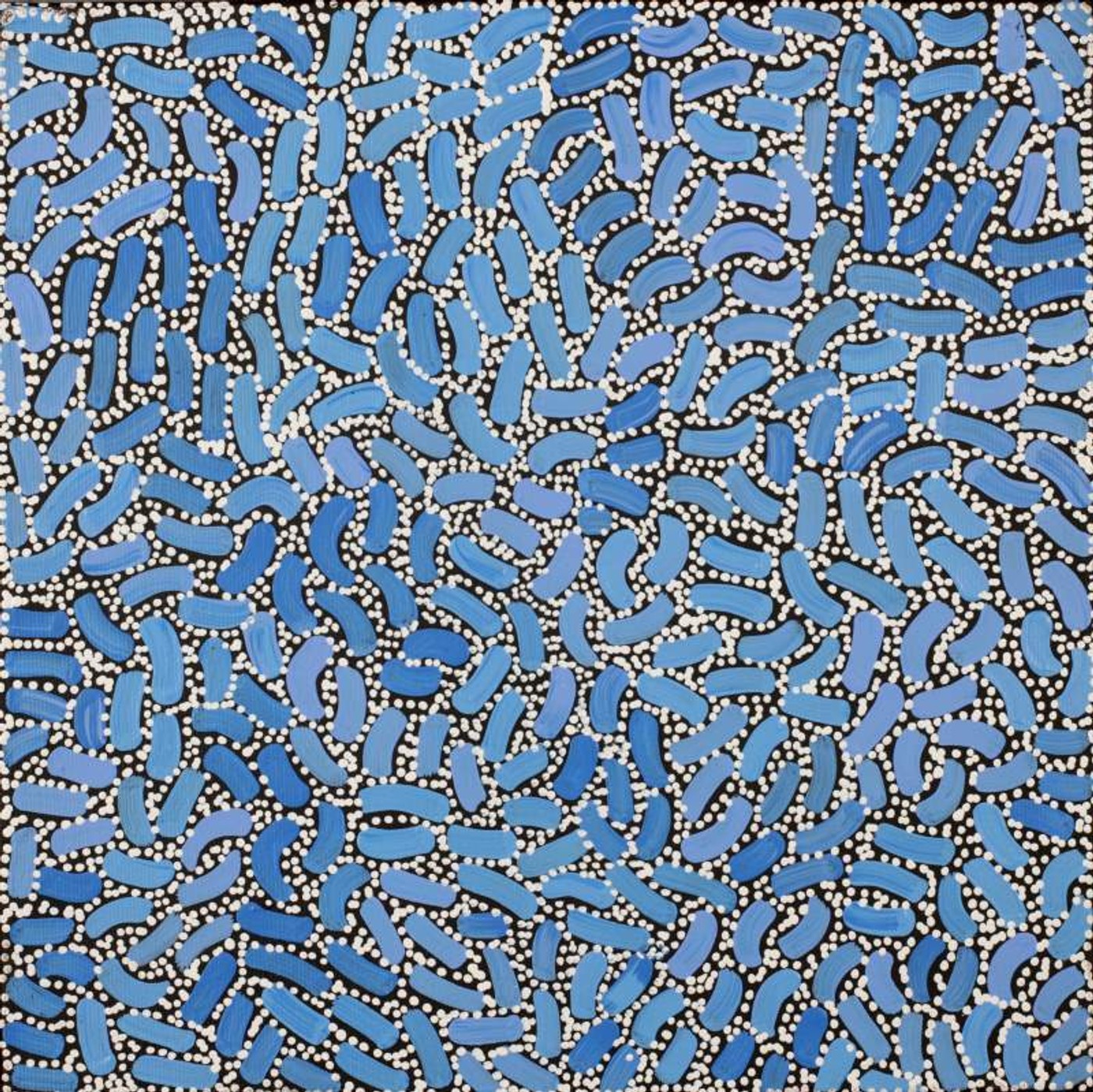 This Dreaming belongs to Warlukurlangu country to the south-west of Yuendumu, for which Jampijinpa/Jangala men and Nampijinpa/Nangala women have custodial responsibility. An old man ‘lungkarda’ (centralian blue-tongued lizard [Tiliqua multifasciata]), of the Jampijinpa skin group, lived on a hill with his two Jangala sons. The old man would feign blindness and send the two boys hunting in search of meat. While they were gone he would hunt and eat anything that he caught before they returned. One day the sons returned with a kangaroo that they had caught after much tracking. Unfortunately the kangaroo was sacred to the ‘lungkarda’, unbeknown to the boys. In his anger the old man decided to punish his sons and the next time they went out, he put his fire stick to the ground and sent a huge bush fire after them which chased them for many miles, at times propelling them through the air. Although the boys beat out the flames, ‘lungkarda’s’ special magic kept the fire alive and it re-appeared out of his blue-tongued lizard hole. Exhausted the boys were finally overcome by the flames. In contemporary Warlpiri paintings traditional iconography is used to represent the Jukurrpa, particular sites and other elements. Usually sites that are depicted in paintings of this Jukurrpa include Warlukurlangu (a men’s cave), Kirrkirrmanu (where the sacred kangaroo was killed), Wayililinypa (where the fire killed the two Jangala sons) and Marnimarnu (a water soakage) where the two Jangalas camped.