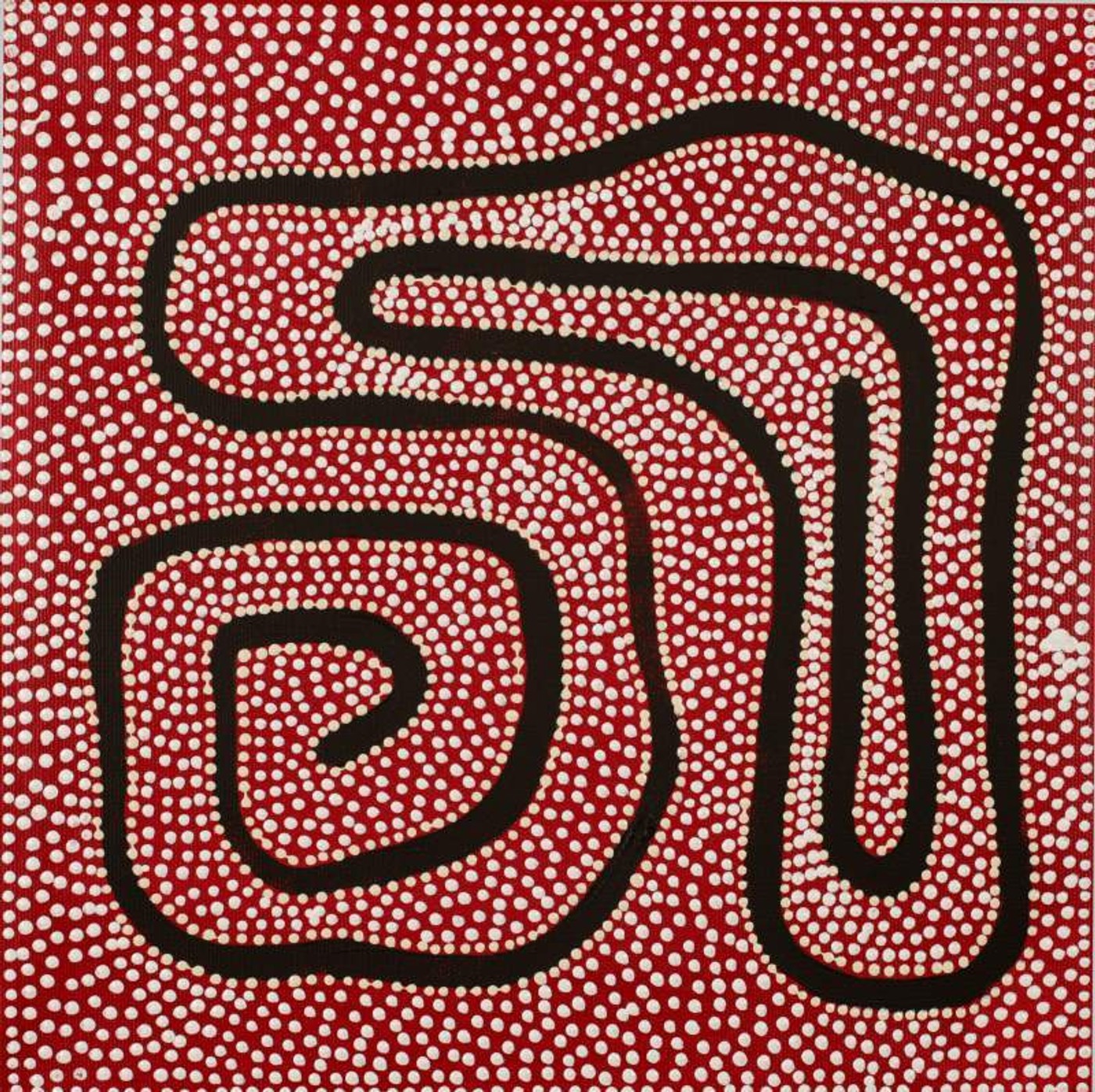The Yarla Jukurrpa (bush potato [Ipomea costata] Dreaming) tells the story of a fight between ‘yarla’ from Yumurrpa and ‘wapirti’ (bush carrot [Vigna lanceolata]) from Wapurtali. The ‘yarla’ were Jakamarra/Jupurrurla skins and they were in conflict over Napaljarri/Napanangka women, who have the right skin for marriage. The fight took place at ‘Ngardirpi. Many men died, their bodies are now sand hills and their blood formed a water soak. ‘Yarla’ are fibrous tubers that grow beneath a low spreading plant, found by looking for cracks in the ground. Yarla are good to eat, when cooked they are really soft and tasty. This Dreaming belongs to Jupurrurla/Jakamarra men and Napurrula/Nakamarra women. Nakamarra and Napurrula ‘karnta’ (women) are shown sitting down at Yumurrpa gathering ‘yarla’ with ‘karlangu’ (digging sticks) and placing them in ‘parraja’ (wooden carrying dishes). In contemporary Warlpiri paintings traditional iconography is used to represent the Jukurrpa, associated sites and other elements. In paintings of this Jukurrpa women are usually depicted by ‘U’ shapes while the ‘yarla’ plants are represented by concentric circles. The ‘watarlapi’ (the lateral ‘yarla’ roots) are shown across the painting, to symbolize the way this Jukurrpa is spread through Warlpiri country.