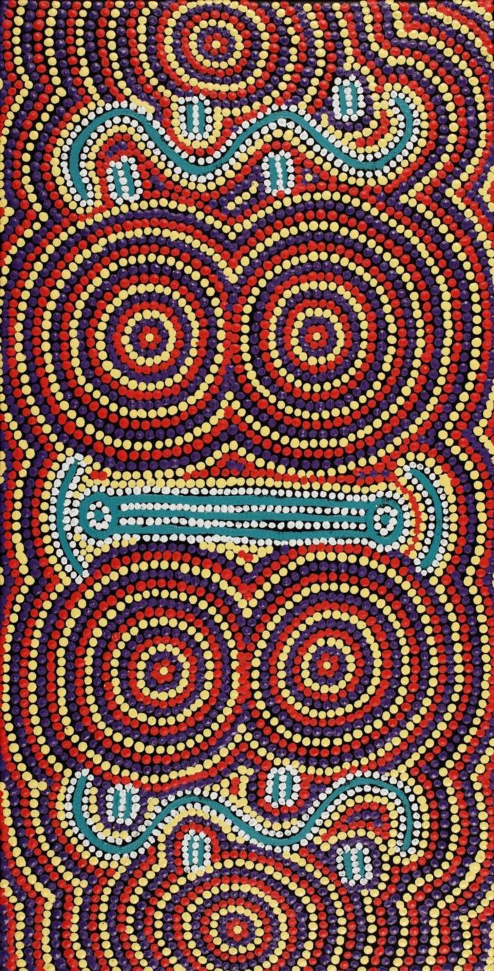 In contemporary Warlpiri paintings, traditional iconography is used to represent the ‘Jukurrpa’ (Dreaming), associated sites, and other elements. In many paintings of this Dreaming, short dashes are often used to represent ‘mangkurdu’ (cumulus & stratocumulus clouds), and longer, flowing lines represent ‘ngawarra’ (flood waters). Small circles are used to depict ‘mulju’ (soakages) and river beds.