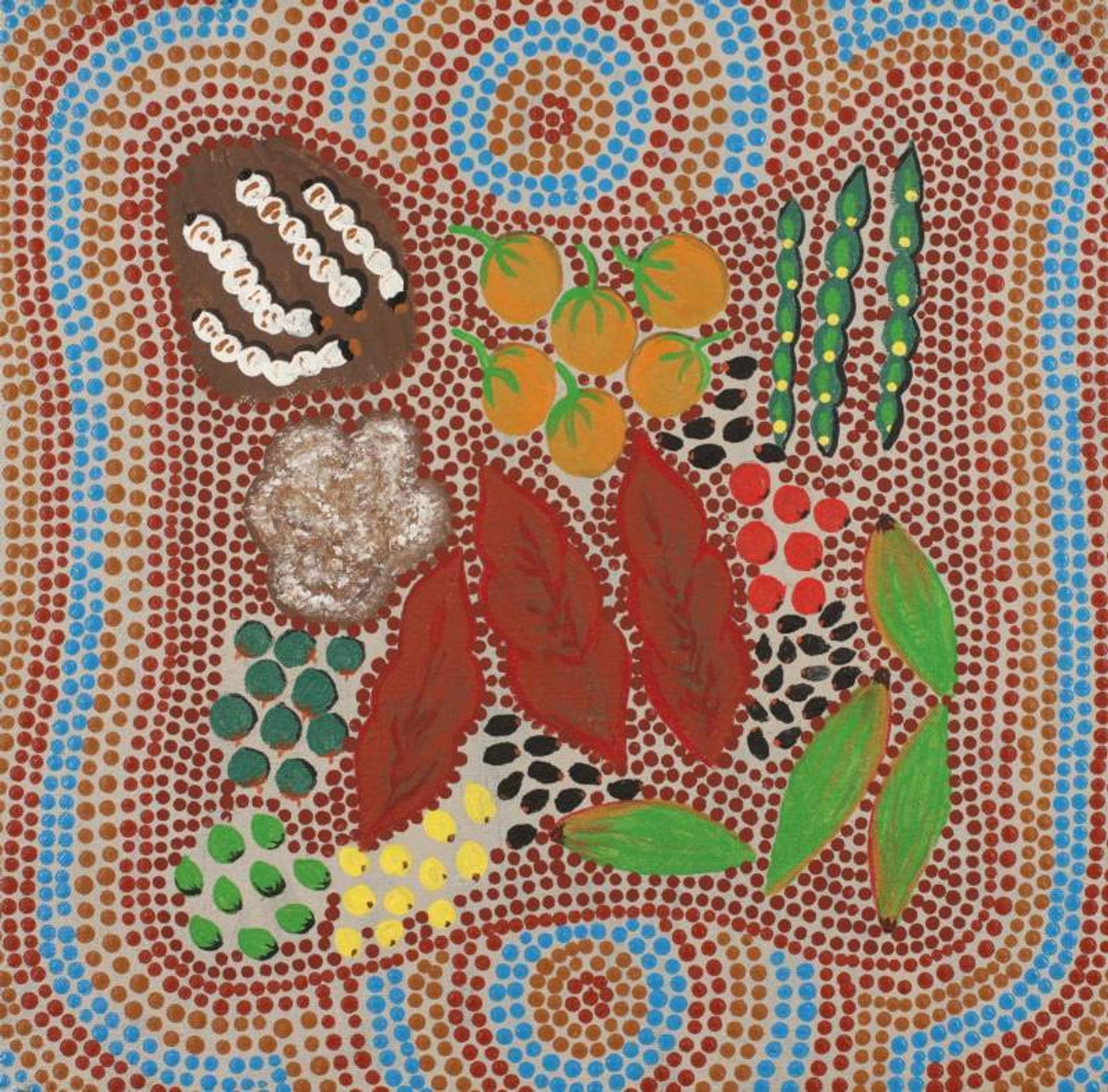 This painting depicts bush tucker, food collected by karnta (women) while out hunting. There is a wide variety of traditional food that warlpiri people continue to gather and consume as a part of their diet. Many of the foods have their own Jukurrpa (dreaming) associated with them. Some of the common bush tucker foods are ngarlkirdi (witchetty grub), wanakiji (bush tomato), yarla (bush potato), janmarda (bush onion), ngarlajiyi (bush carrot), Lukarrara (fringe rush seed), and yuparli (bush banana)