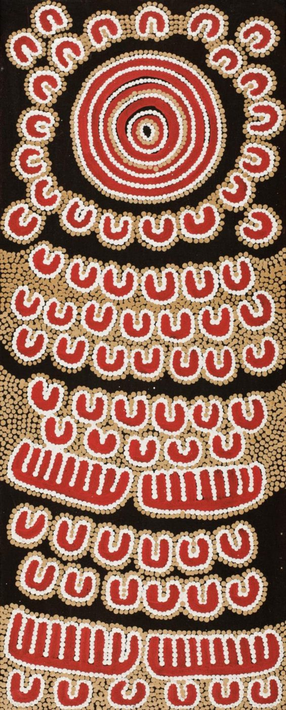 This painting depicts Nakamarra and Napurrurla women hunting for bush foods. The ‘kirda’ (owners) for this story are Nakamarra/Napurrurla women and Jakamarra/Jupurrurla men. Yumurrpa and Wapurtali are two major Dreaming sites owned by the Nakamarra/Jakamarra and Napurrurla/Jupurrurla subsections; these sites are also associated with bush food Dreamings. Yumurrpa is a major waterhole to the northwest of Yuendumu and a ‘yarla’ (bush potato [Ipomea costata]) Dreaming site. The area north of Wapurtali/Yintaramurru (Mt. Singleton) is a ‘wanakiji’ (bush tomato [Solanum chippendalei]) Dreaming site.