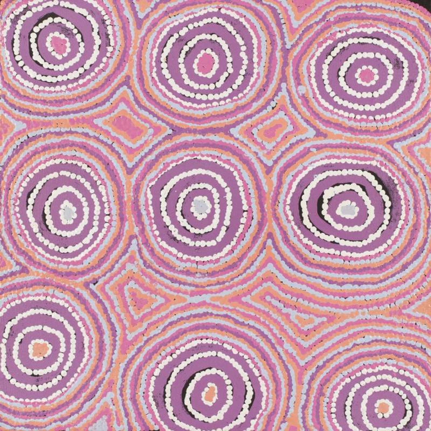 The subject of this work is Lappi Lappi, a rock hole near Lake Hazlett, about 90 km northwest of Lake Mackay in Western Australia. The country belongs to Nampijinpa/Jampijinpa and Nangala/Jangala skin groups. Located in a sheltered basin, the rock hole at Lappi Lappi is a permanent source of water, and is surrounded by country rich in bush tucker. In the time of the Jukurrpa (Dreamtime) many mothers with young children would gather there because it was a safe place to stay. The rock hole at Lappi Lappi is home to a ‘warnayarra’, a rainbow serpent that travels underground between various rock holes. One day, women were gathered at the rock hole with their children, singing and dancing. When the ‘warnayarra’ heard the sound of voices, it travelled silently towards them, under the water. When it reached the edge of the rock hole, it rose out of the water and ate them all.