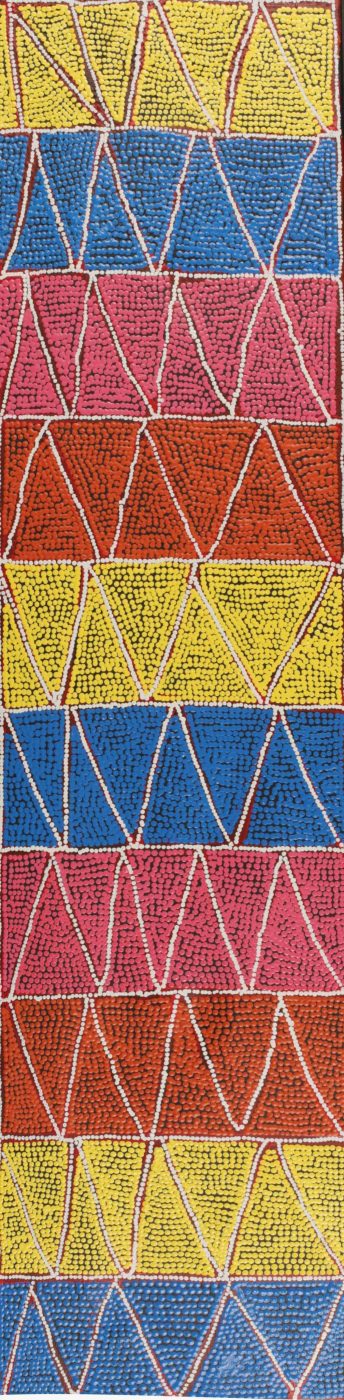 The custodians of the Yawakiyi Jukurrpa (native currant Dreaming [Canthium latifolium]) are Napurrurla/Nakamarra women and Jupurrurla/ Jakamarra men. The ‘yawakiji’ tree is large and it bears small, black currant-like fruits. Traditionally the fruit would be gathered by women and placed in wooden food carriers. They are mixed with water before been eaten, although the ‘yawakiyi’ are sweet and can be also eaten straight off the tree. Shown in this painting are the Nakamarra and Napurrurla women collecting ‘yawakiyi’ at a place called Mititinyanyanu to the north-west of Yuendumu. The white flowers come out first then the ‘yawakiyi’ fruit grows after heavy rain. Magpie bird also eats the ‘yawakiyi’. In contemporary Warlpiri paintings traditional iconography is used to represent the Jukurrpa, associated sites and other elements. In paintings of this Jukurrpa the branches of ‘yawakiyi’ are shown spread out across the country. The ‘U’ shapes represent women, while the oval shapes beside them usually depict ‘parrajas’, which are the food carriers used to collect the fruit.