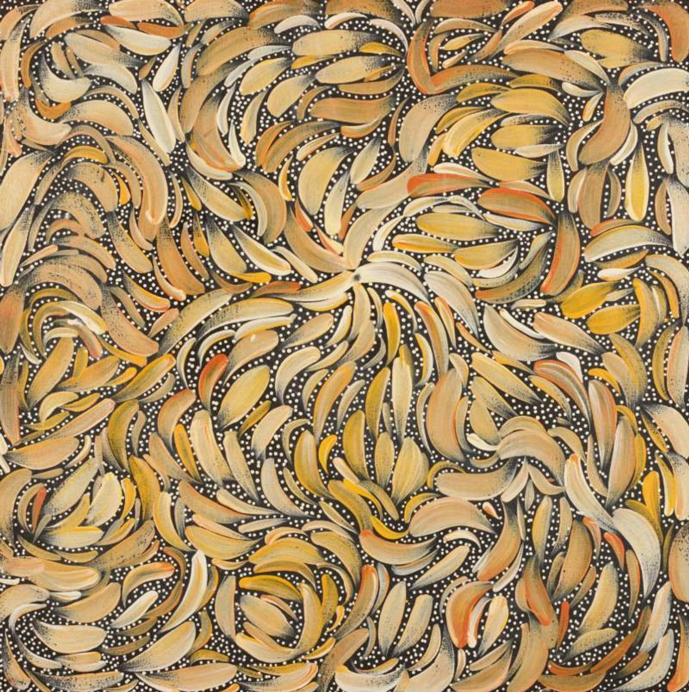 This ‘purrpalanji Jukurrpa’ (skinny bush banana Dreaming) comes from Pikilyi (Vaughan Springs), a large waterhole and natural spring to the west of Yuendumu, close to Mount Doreen. Napangardi/Napanangka women and Japangardi/Japanangka men are the ‘kirda’ (owners) of the skinny bush banana Dreaming at Pikilyi. Nangala women and Jangala men are the ‘kurdungurlu’ (custodians) of this Dreaming.
