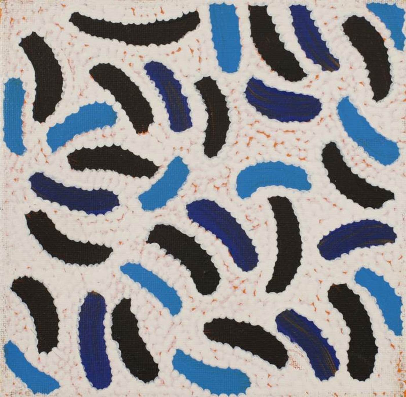 This Yarla Jukurrpa belongs to men of the Japaljarri/Jungarrayi subsections and to Napaljarri/Nungarrayi women. It comes from an area to the east of Yuendumu called Cockatoo Creek. ‘Yarla’ (bush potato [Ipomea costata]) are fibrous tubers that grow beneath a low spreading plant, found by looking for cracks in the ground. This edible tuber grows from ‘yartura’ (roots) which seek out moisture to spout new plants. Yarla are good to eat, when cooked they are really soft and tasty. The Jukurrpa tells of ‘yarla’ and ‘wapirti’ (bush carrot [Vigna lanceolata]) ancestors fighting a big battle in this area. The specific site associated with this painting is a ‘mulju’ (water soakage) called Ngarparapunyu. In contemporary Warlpiri paintings traditional iconography is used to represent the Jukurrpa, associated sites and other elements. The curved lines of the ‘kuruwarri’ (ceremonial designs) represent the ‘ngamarna’ (vine-like tendrils) from which grow ‘jinjirla’ (flowers). ‘Karlangu’ (digging sticks) are usually represented as straight lines. ‘Karlangu’are used by women to dig for bush tucker like Yarla and Wapirti which are found underground.
