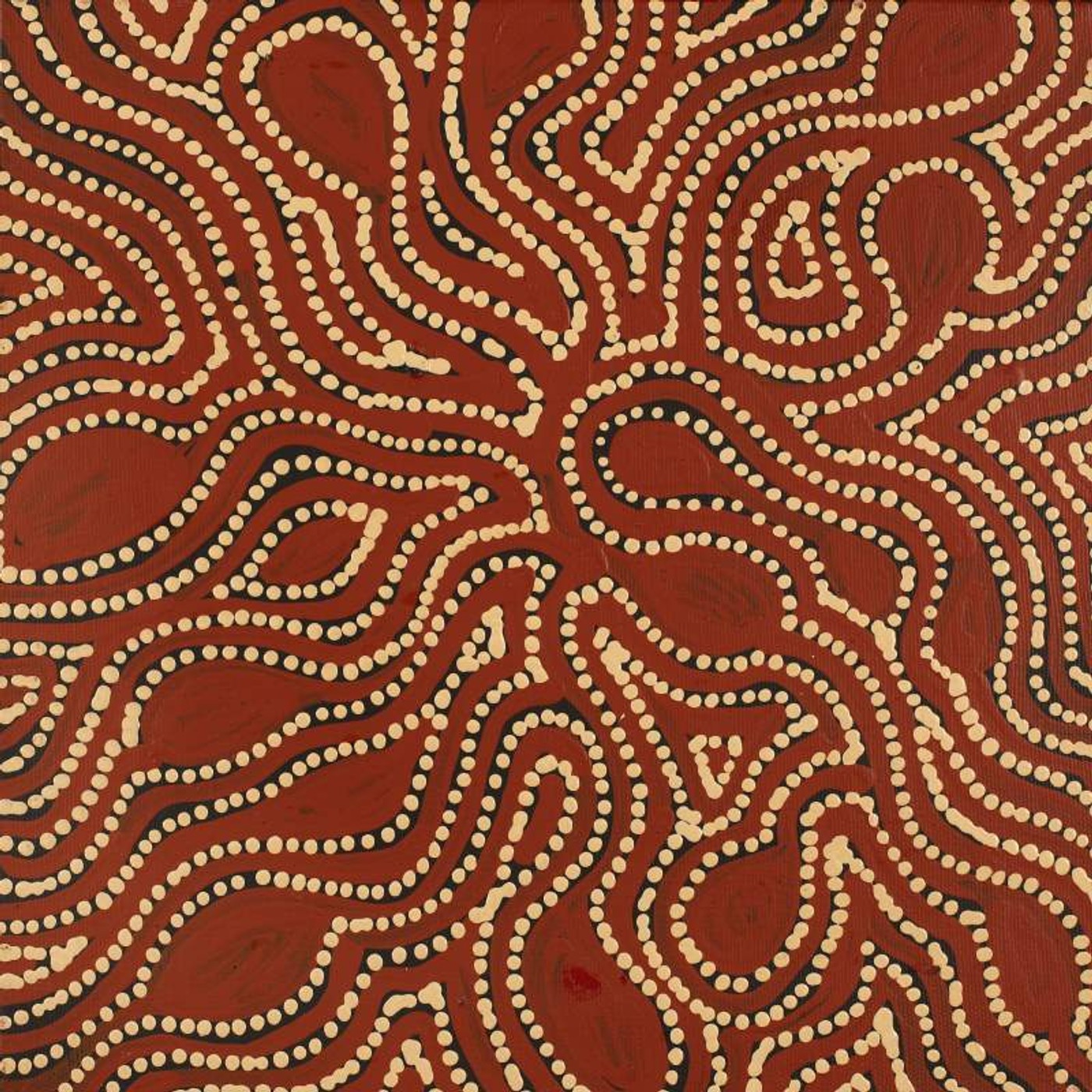 This painting depicts the Pamapardu Jukurrpa (Flying Ant Dreaming) from Warntungurru, west of Yuendumu. ‘Pamapardu’ is the Warlpiri name for the flying ants or termites that build the large anthills found throughout Warlpiri country. This country belongs to Nakamarra/Napurrurla women and Jakamarra/Jupurrurla men. ‘Pamapardu’ are flying ants. They build earth mounds (‘mingkirri’) that are common in the Tanami area. When heavy rains come in summer the ‘mingkirri’ get flooded out, so the ‘pamapardu’ grow wings and fly off to make new homes, following their queens to dry mounds or to build a new. When they have found their new home they drop their wings. In this stage they can be collected, lightly cooked in coals and eaten. As they fall to the ground women collect them to eat because they are nice and sweet. In contemporary Warlpiri paintings traditional iconography is used to represent the Jukurrpa, particular sites and other elements. When this Jukurrpa story is painted concentric circles are used to represent the ‘mingkirri’ and the rockholes involved in the story, including the central one at Wapurtali (Mt Singleton). Dashes are often depicted around the circles to represent the ‘pamapardu’.