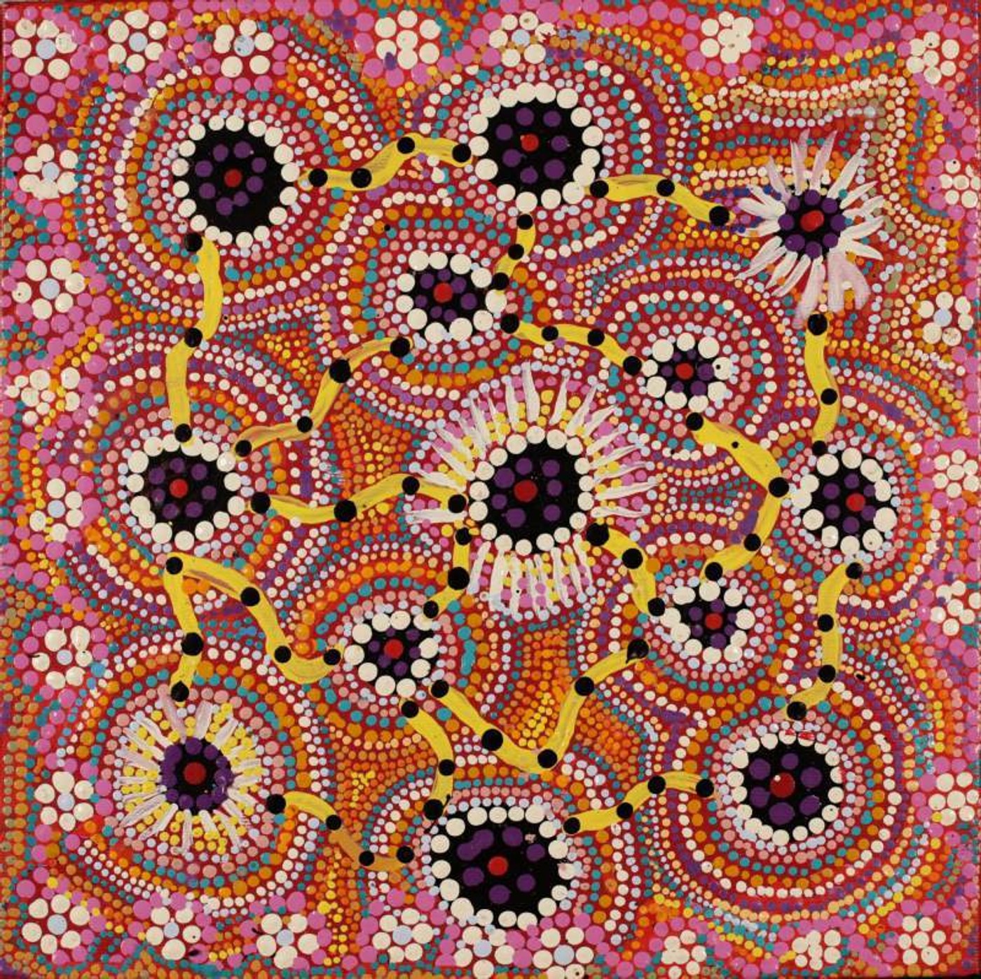 The place depicted in this painting, Ngama, is located south of Yuendumu in the Northern Territory. This Dreaming belongs to Nakamarra/Napurrurla women and Jakamarra/Jupurrurla men. This story describes the journey of Yarripiri, an ancestral ‘warna’ (snake). He travelled from Wirnparrku near Mt. Liebig to Yimparlu, and continued its way through the territories of Ngapanangka-jarra, Warlajirryi, Kurnmundu, Yinyirrinyi on to Ngama. Later Yarripiri travelled further north via Mijirlparnta (Mission Creek) and right through to the top end of Australia.Yarripiri was very sad as his family had left him behind at Wirnparrku. He was blind and crippled but he was determined to follow and search them out. He had to be carried. This was the job undertaken by the ‘kurdungurlu’ (ceremonial police) of the Dreaming: the Nangala/Nampijinpa women and Jangala/Jampijinpa men. Where Yarripiri’s tail slumped and touched the ground creeks were formed, such as Mijirlparnta, west of Yuendumu. Yarripiri tracks and paths are often represented by arc shapes or curved lines depicted across the canvas.