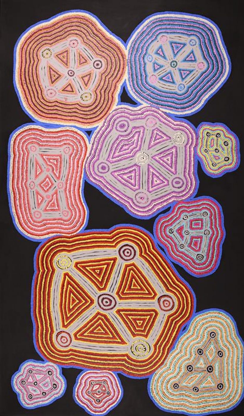 This particular site of the Yankirri Jukurrpa, (emu Dreaming [Dromaius novaehollandiae]) is at Ngarlikurlangu, north of Yuendumu. The ‘yankirri’ travelled to the rockhole at Ngarlikurlangu to find water. This Jukurrpa story belongs to Jangala/Jampijinpa men and Nangala/Nampijinpa women. In contemporary Warlpiri paintings traditional iconography is used to represent the Jukurrpa, associated sites and other elements. Emus are usually represented by their ‘wirliya’ (footprints), arrow-like shapes that show them walking around Ngarlikurlangu eating ‘yakajirri’ (bush raisin [Solanum centrale]). In the time of the Jukurrpa there was a fight at Ngarlikiurlangu between a ‘yankirri’ ancestor and Wardilyka (Australian bustard [Ardeotis australis]) ancestors over sharing the ‘yakajirri’. There is also a dance for this Jukurrpa that is performed during initiation ceremonies.