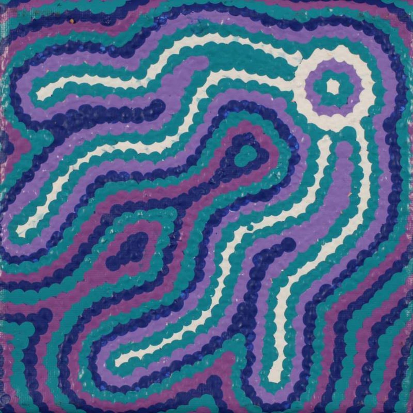 The site depicted in this painting is Pirlinyarnu (Mt. Farewell), about 165 km west of Yuendumu in the Northern Territory. The ‘kirda’ (owners) for the water Dreaming site at Pirlinyarnu are Nangala/Nampijinpa women and Jangala/Jampijinpa men.
