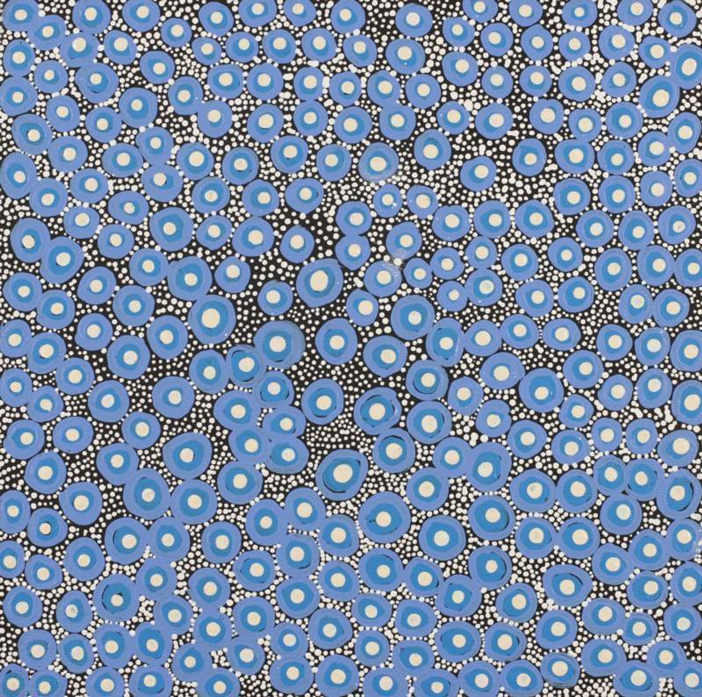 Nakamarra/Napurrurla women and Jakamarra/Jupurrurla men. The Jukurrpa is associated with a place called Jaralypari, north of Yuendumu. Lukarrara is a species of Fimbristylis, a grass that bears edible seeds in the winter-time. The seeds are traditionally ground on a large stone (‘puturlu’) with a smaller stone (‘ngalikirri’) to make flour. This flour is mixed with water (‘ngapa’) to make small seed cakes. In contemporary Warlpiri paintings traditional iconography is used to represent the Jukurrpa, particular sites and other elements. In paintings of this Jukurrpa large concentric circles are used to represent Jaralypari and dots surrounding these circles are often depicting the ‘ngurlu’.