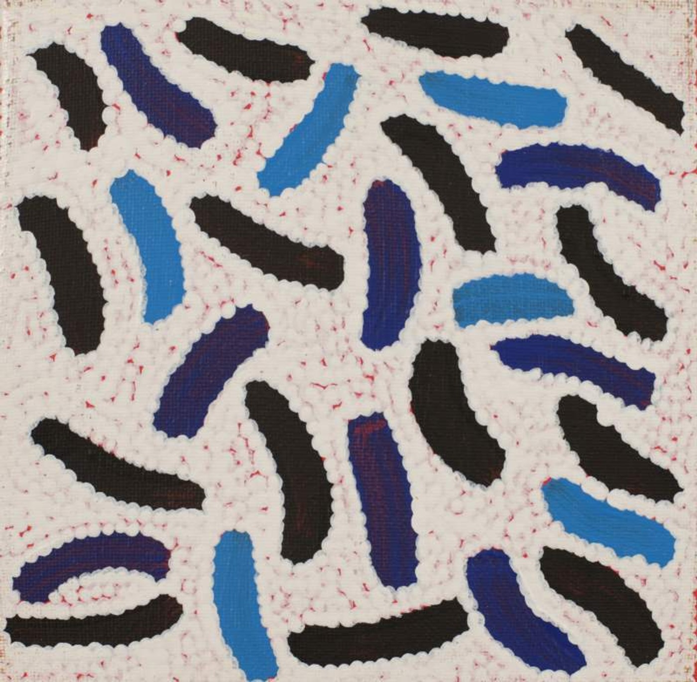 This Yarla Jukurrpa belongs to men of the Japaljarri/Jungarrayi subsections and to Napaljarri/Nungarrayi women. It comes from an area to the east of Yuendumu called Cockatoo Creek. ‘Yarla’ (bush potato [Ipomea costata]) are fibrous tubers that grow beneath a low spreading plant, found by looking for cracks in the ground. This edible tuber grows from ‘yartura’ (roots) which seek out moisture to spout new plants. Yarla are good to eat, when cooked they are really soft and tasty. The Jukurrpa tells of ‘yarla’ and ‘wapirti’ (bush carrot [Vigna lanceolata]) ancestors fighting a big battle in this area. The specific site associated with this painting is a ‘mulju’ (water soakage) called Ngarparapunyu. In contemporary Warlpiri paintings traditional iconography is used to represent the Jukurrpa, associated sites and other elements. The curved lines of the ‘kuruwarri’ (ceremonial designs) represent the ‘ngamarna’ (vine-like tendrils) from which grow ‘jinjirla’ (flowers). ‘Karlangu’ (digging sticks) are usually represented as straight lines. ‘Karlangu’are used by women to dig for bush tucker like Yarla and Wapirti which are found underground.