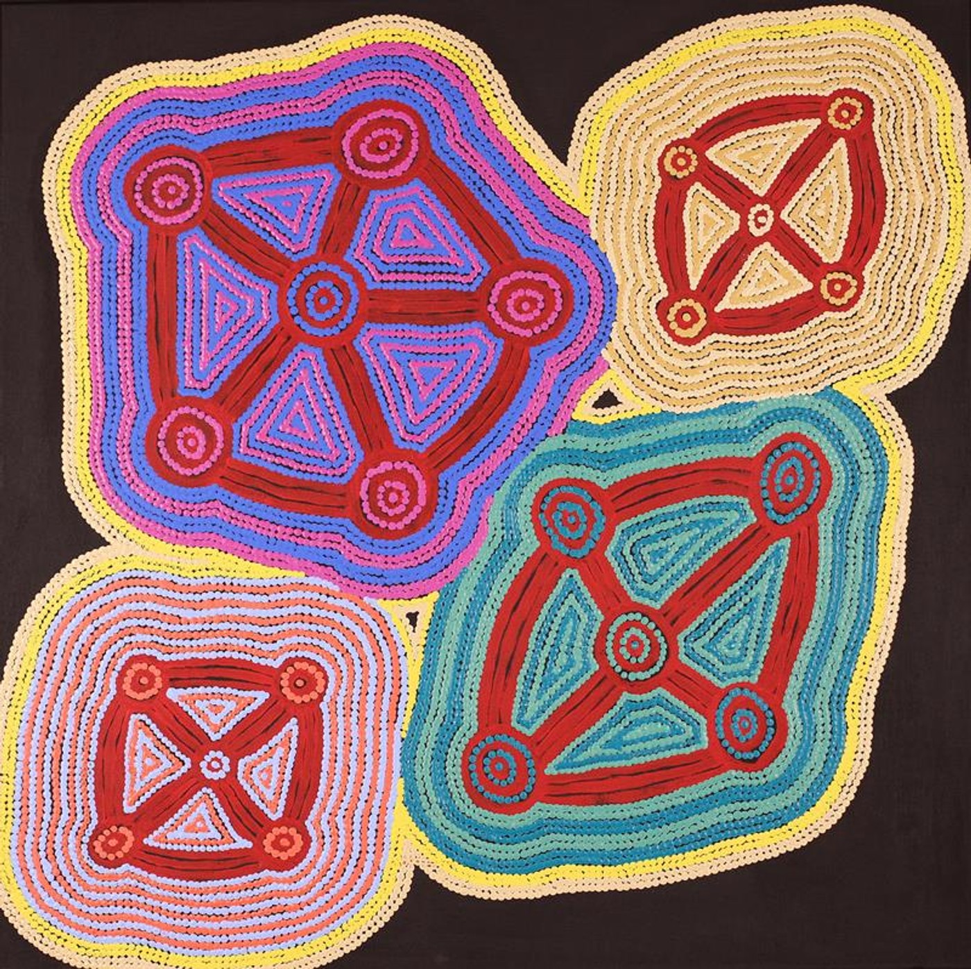 This particular site of the Yankirri Jukurrpa, (emu Dreaming [Dromaius novaehollandiae]) is at Ngarlikurlangu, north of Yuendumu. The ‘yankirri’ travelled to the rockhole at Ngarlikurlangu to find water. This Jukurrpa story belongs to Jangala/Jampijinpa men and Nangala/Nampijinpa women. In contemporary Warlpiri paintings traditional iconography is used to represent the Jukurrpa, associated sites and other elements. Emus are usually represented by their ‘wirliya’ (footprints), arrow-like shapes that show them walking around Ngarlikurlangu eating ‘yakajirri’ (bush raisin [Solanum centrale]). In the time of the Jukurrpa there was a fight at Ngarlikiurlangu between a ‘yankirri’ ancestor and Wardilyka (Australian bustard [Ardeotis australis]) ancestors over sharing the ‘yakajirri’. There is also a dance for this Jukurrpa that is performed during initiation ceremonies.