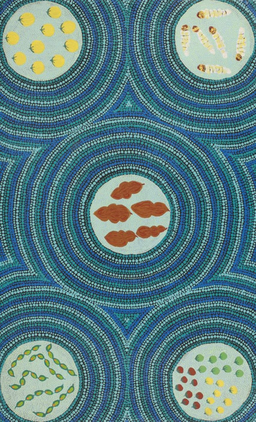 This painting depicts bush tucker, food collected by karnta (women) while out hunting. There is a wide variety of traditional food that warlpiri people continue to gather and consume as a part of their diet. Many of the foods have their own Jukurrpa (dreaming) associated with them. Some of the common bush tucker foods are ngarlkirdi (witchetty grub), wanakiji (bush tomato), yarla (bush potato), janmarda (bush onion), ngarlajiyi (bush carrot), Lukarrara (fringe rush seed), and yuparli (bush banana)