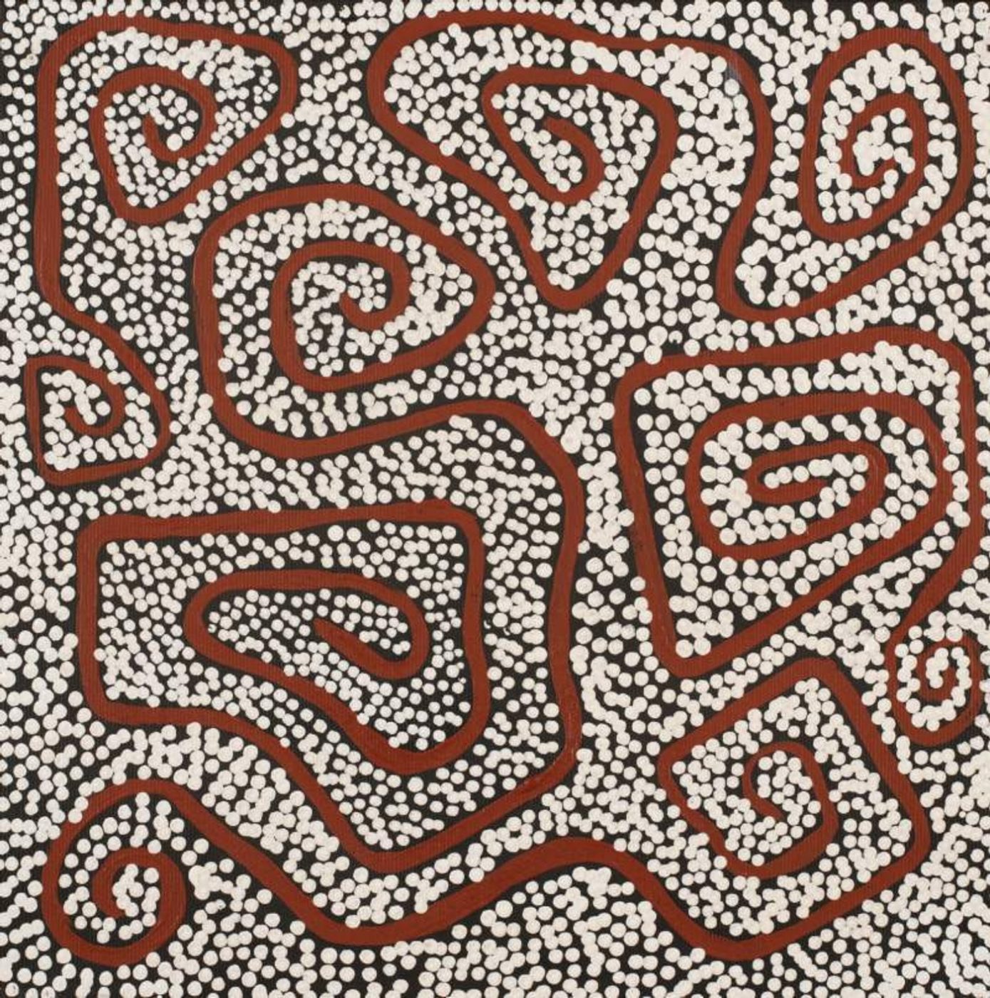 The Yarla Jukurrpa (bush potato [Ipomea costata] Dreaming) tells the story of a fight between ‘yarla’ from Yumurrpa and ‘wapirti’ (bush carrot [Vigna lanceolata]) from Wapurtali. The ‘yarla’ were Jakamarra/Jupurrurla skins and they were in conflict over Napaljarri/Napanangka women, who have the right skin for marriage. The fight took place at ‘Ngardirpi. Many men died, their bodies are now sand hills and their blood formed a water soak. ‘Yarla’ are fibrous tubers that grow beneath a low spreading plant, found by looking for cracks in the ground. Yarla are good to eat, when cooked they are really soft and tasty. This Dreaming belongs to Jupurrurla/Jakamarra men and Napurrula/Nakamarra women. Nakamarra and Napurrula ‘karnta’ (women) are shown sitting down at Yumurrpa gathering ‘yarla’ with ‘karlangu’ (digging sticks) and placing them in ‘parraja’ (wooden carrying dishes). In contemporary Warlpiri paintings traditional iconography is used to represent the Jukurrpa, associated sites and other elements. In paintings of this Jukurrpa women are usually depicted by ‘U’ shapes while the ‘yarla’ plants are represented by concentric circles. The ‘watarlapi’ (the lateral ‘yarla’ roots) are shown across the painting, to symbolize the way this Jukurrpa is spread through Warlpiri country.