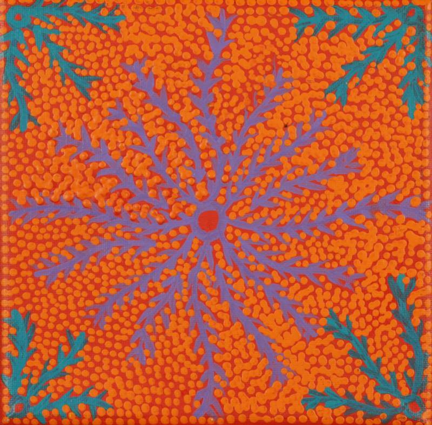The Wanakiji Jukurrpa (bush tomato [Solanum chippendalei] Dreaming) travels through Yaturlu (near Mount Theo, north of Yuendumu). “Wanakiji” grows in open spinifex country and is a small, prickly plant with purple flowers that bears green fleshy fruit with many small black seeds. After collecting the fruit the seeds are removed with a small wooden spoon called ‘kajalarra’. The fruit then can be eaten raw or threaded onto skewers called ‘turlturrpa’ and then cooked over a fire. ‘Wanakiji’ can also be skewered and left to dry. When they are prepared in this way it is called ‘turlturrpa’ and the fruit can be kept for a long time. In contemporary Warlpiri paintings traditional iconography is used to represent the Jukurrpa, particular sites and other elements. The Wanakiji Jukurrpa belongs to Napanangka/Napangardi women and Japanangka/Japangardi men.
