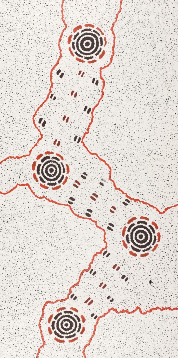 Janganpa Jukurrpa (common brush-tail possum [Trichosurus vulpecula] Dreaming) travels all over Warlpiri country. ‘Janganpa’ are nocturnal animals that often nest in the hollows of white gum trees (‘wapunungka’). This story comes from a big hill called Mawurrji, west of Yuendumu and north of Pikilyi (Vaughan Springs). A group of ‘janganpa’ ancestors resided there. Every night they would go out in search of food. Their hunting trips took them to Wirlki and Wanapirdi, where they found ‘pamapardu’ (flying ants). They journeyed on to Ngarlkirdipini looking for water. A Nampijinpa women was living at Mawurrji with her two daughters. She gave her daughters in marriage to a Jupurrurla ‘janganpa’ but later decided to run away with them. The Jupurrurla angrily pursued the woman. He tracked them to Mawurrji where he killed them with a stone axe. Their bodies are now rocks at this place. Warlpiri people perform a young men’s initiation ceremony, which involves the Janganpa Jukurrpa. The Janganpa Jukurrpa belongs to Jakamarra/Jupurrurla men and Nakamarra/Napurrurla women. In Warlpiri paintings traditional iconography is used to represent this Jukurrpa. ‘Janganpa’ tracks are often represented as ‘E’ shaped figures and concentric circles are used to depict the trees in which the ‘janganpa’ live, and also the sites at Mawurrji.