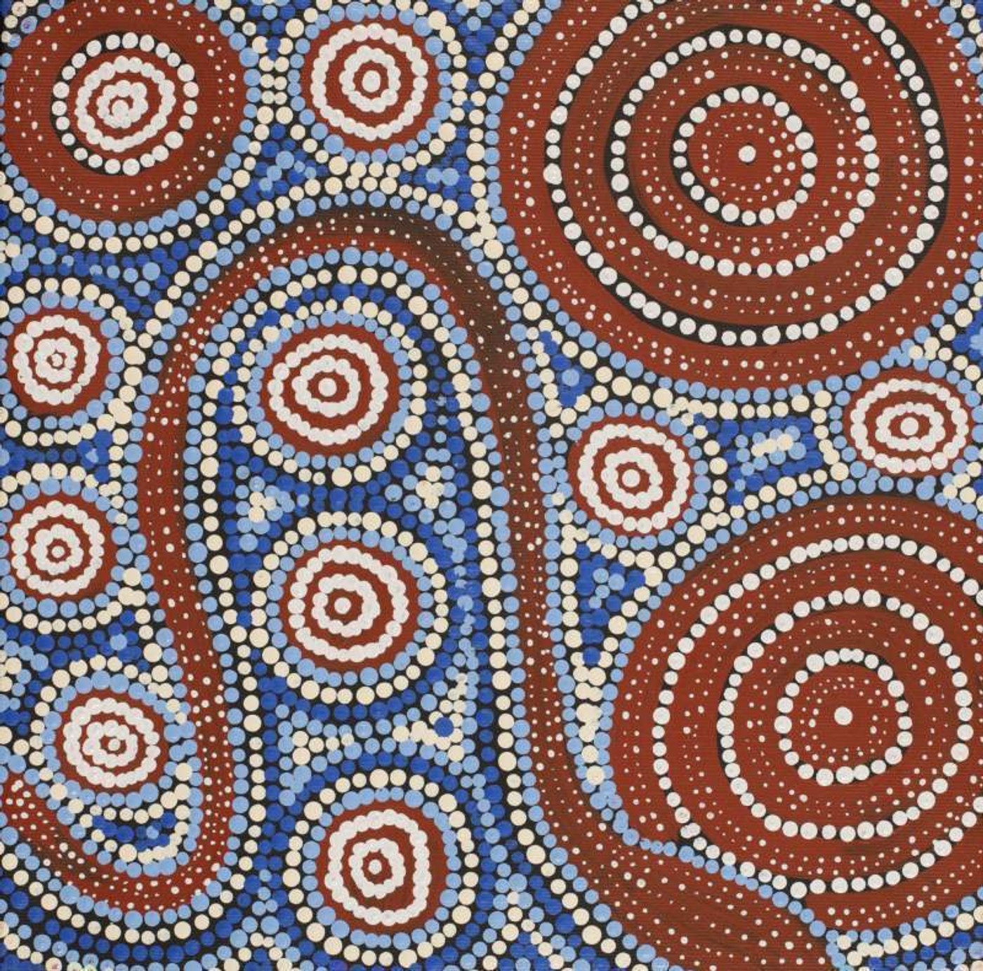 The place depicted in this painting, Ngama, is located south of Yuendumu in the Northern Territory. This Dreaming belongs to Nakamarra/Napurrurla women and Jakamarra/Jupurrurla men. This story describes the journey of Yarripiri, an ancestral ‘warna’ (snake). He travelled from Wirnparrku near Mt. Liebig to Yimparlu, and continued its way through the territories of Ngapanangka-jarra, Warlajirryi, Kurnmundu, Yinyirrinyi on to Ngama. Later Yarripiri travelled further north via Mijirlparnta (Mission Creek) and right through to the top end of Australia.Yarripiri was very sad as his family had left him behind at Wirnparrku. He was blind and crippled but he was determined to follow and search them out. He had to be carried. This was the job undertaken by the ‘kurdungurlu’ (ceremonial police) of the Dreaming: the Nangala/Nampijinpa women and Jangala/Jampijinpa men. Where Yarripiri’s tail slumped and touched the ground creeks were formed, such as Mijirlparnta, west of Yuendumu. Yarripiri tracks and paths are often represented by arc shapes or curved lines depicted across the canvas.