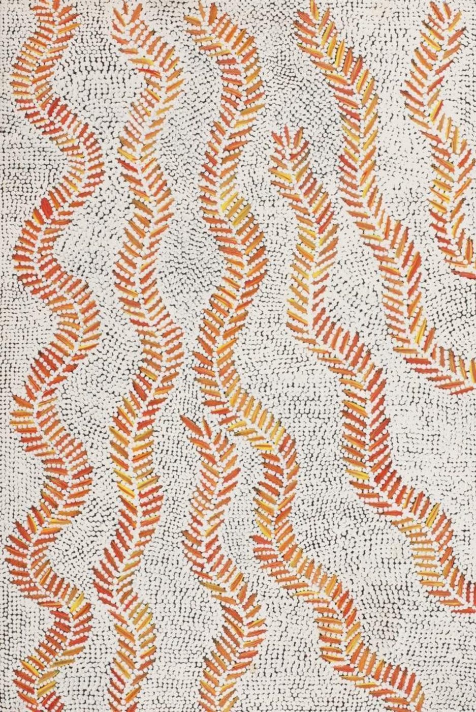 Aboriginal medicine is widely practised in the Northern Territory today. It is a complex system closely linked to the culture and beliefs of the people, their understanding of the land and its flora and fauna. It is a holistic approach, intergrating the social, physical and spiritual aspects of health and life. The Warlpiri health system includes the ngangkayikirlior traditional healers; the Yawulyuceremonies, (Napangardi Women’s Jukurrpa); and the Herbal or Bush Medicine. Depicted in this painting are the bush medicine plants that grow on traditional homelands in the Northern Territory, plants that are collected by the women. The Warlpiri have extensive knowledge of plants, and the use of bush medicine is shared by the whole family and not to any particular group.