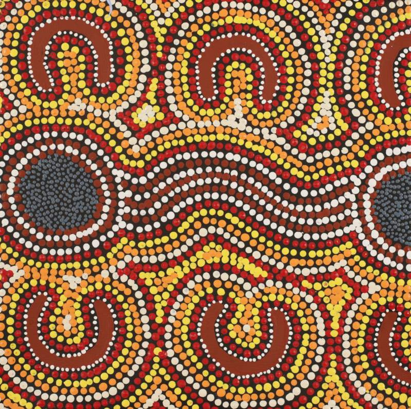 This painting depicts Nakamarra and Napurrurla women hunting for bush foods. The ‘kirda’ (owners) for this story are Nakamarra/Napurrurla women and Jakamarra/Jupurrurla men. Yumurrpa and Wapurtali are two major Dreaming sites owned by the Nakamarra/Jakamarra and Napurrurla/Jupurrurla subsections; these sites are also associated with bush food Dreamings. Yumurrpa is a major waterhole to the northwest of Yuendumu and a ‘yarla’ (bush potato [Ipomea costata]) Dreaming site. The area north of Wapurtali/Yintaramurru (Mt. Singleton) is a ‘wanakiji’ (bush tomato [Solanum chippendalei]) Dreaming site.