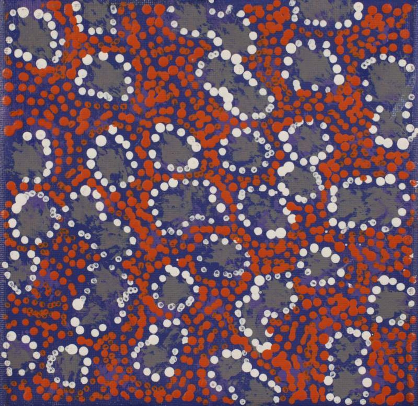 This Dreaming belongs to Warlukurlangu country to the south-west of Yuendumu, for which Jampijinpa/Jangala men and Nampijinpa/Nangala women have custodial responsibility. An old man ‘lungkarda’ (centralian blue-tongued lizard [Tiliqua multifasciata]), of the Jampijinpa skin group, lived on a hill with his two Jangala sons. The old man would feign blindness and send the two boys hunting in search of meat. While they were gone he would hunt and eat anything that he caught before they returned. One day the sons returned with a kangaroo that they had caught after much tracking. Unfortunately the kangaroo was sacred to the ‘lungkarda’, unbeknown to the boys. In his anger the old man decided to punish his sons and the next time they went out, he put his fire stick to the ground and sent a huge bush fire after them which chased them for many miles, at times propelling them through the air. Although the boys beat out the flames, ‘lungkarda’s’ special magic kept the fire alive and it re-appeared out of his blue-tongued lizard hole. Exhausted the boys were finally overcome by the flames. In contemporary Warlpiri paintings traditional iconography is used to represent the Jukurrpa, particular sites and other elements. Usually sites that are depicted in paintings of this Jukurrpa include Warlukurlangu (a men’s cave), Kirrkirrmanu (where the sacred kangaroo was killed), Wayililinypa (where the fire killed the two Jangala sons) and Marnimarnu (a water soakage) where the two Jangalas camped.