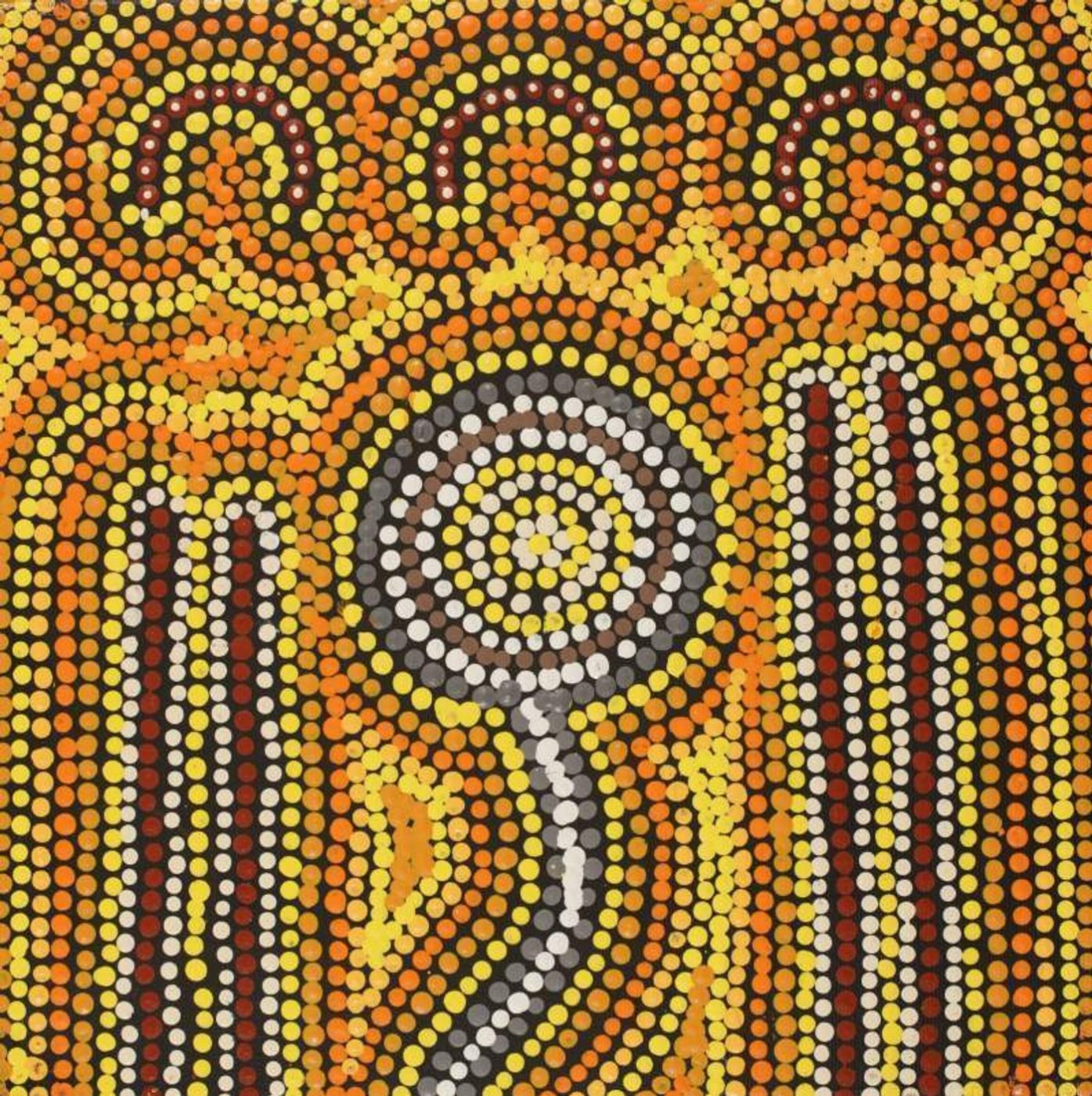 This painting depicts Nakamarra and Napurrurla women hunting for bush foods. The ‘kirda’ (owners) for this story are Nakamarra/Napurrurla women and Jakamarra/Jupurrurla men. Yumurrpa and Wapurtali are two major Dreaming sites owned by the Nakamarra/Jakamarra and Napurrurla/Jupurrurla subsections; these sites are also associated with bush food Dreamings. Yumurrpa is a major waterhole to the northwest of Yuendumu and a ‘yarla’ (bush potato [Ipomea costata]) Dreaming site. The area north of Wapurtali/Yintaramurru (Mt. Singleton) is a ‘wanakiji’ (bush tomato [Solanum chippendalei]) Dreaming site.