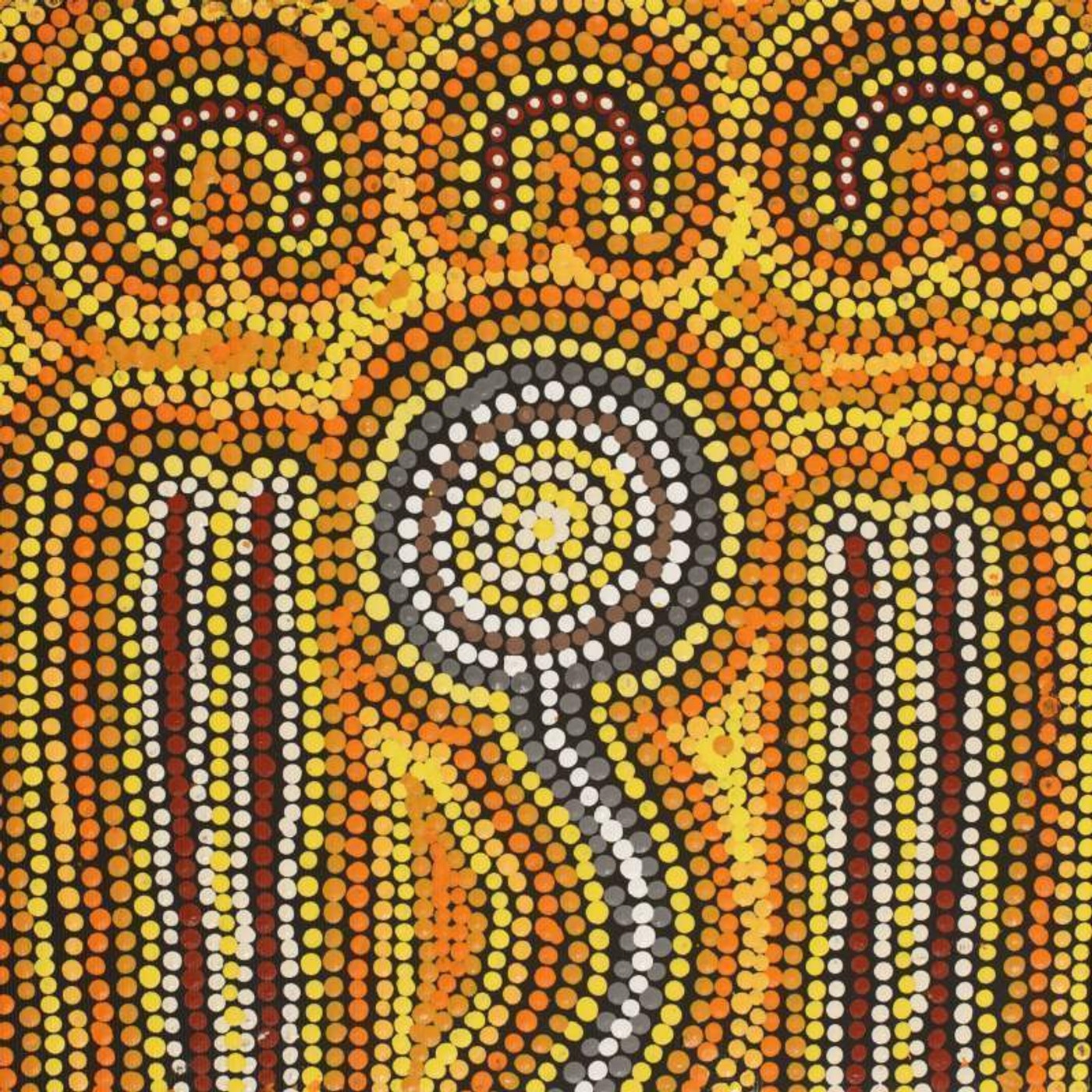 This painting depicts Nakamarra and Napurrurla women hunting for bush foods. The ‘kirda’ (owners) for this story are Nakamarra/Napurrurla women and Jakamarra/Jupurrurla men. Yumurrpa and Wapurtali are two major Dreaming sites owned by the Nakamarra/Jakamarra and Napurrurla/Jupurrurla subsections; these sites are also associated with bush food Dreamings. Yumurrpa is a major waterhole to the northwest of Yuendumu and a ‘yarla’ (bush potato [Ipomea costata]) Dreaming site. The area north of Wapurtali/Yintaramurru (Mt. Singleton) is a ‘wanakiji’ (bush tomato [Solanum chippendalei]) Dreaming site.