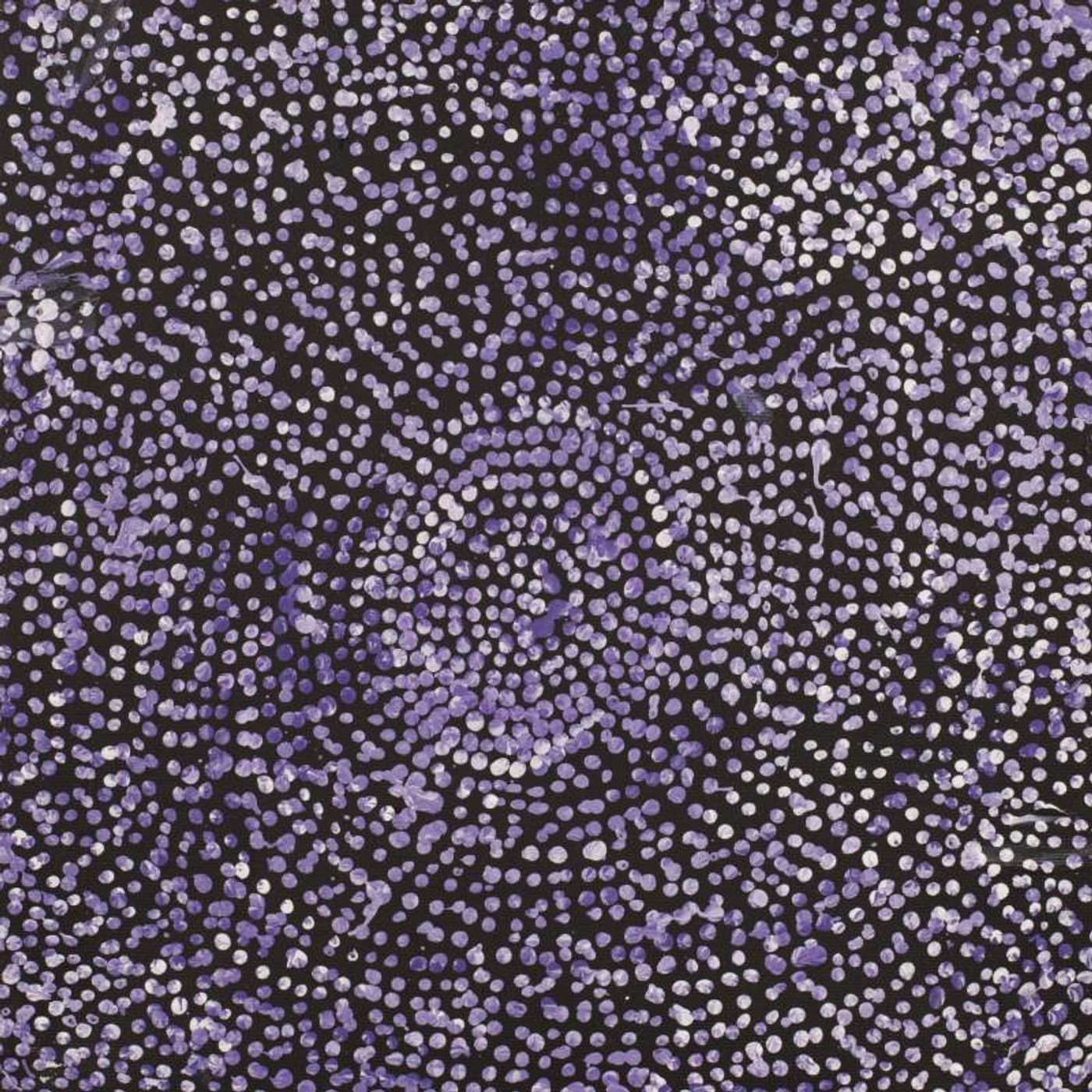 The site depicted in this painting is Puyurru, west of Yuendumu. In the usually dry creek beds are ‘mulju’ (soakages), or naturally occurring wells. The ‘kirda’ (owners) for this site are Nangala/Nampijinpa women and Jangala/Jampijinpa men. Two Jangala men, rainmakers, sang the rain, unleashing a giant storm. The storm travelled across the country from the east to the west, initially travelling with a ‘pamapardu Jukurrpa’ (termite Dreaming) from Warntungurru to Warlura, a waterhole 8 miles east of Yuendumu. At Warlura, a gecko called Yumariyumari blew the storm on to Lapurrukurra and Wilpiri. Bolts of lightning shot out at Wirnpa (also called Mardinymardinypa) and at Kanaralji. At this point the Dreaming track also includes the ‘kurdukurdu mangkurdu Jukurrpa’ (children of the clouds Dreaming). The water Dreaming built hills at Ngamangama using baby clouds and also stuck long pointy clouds into the ground at Jukajuka, where they can still be seen today as rock formations.