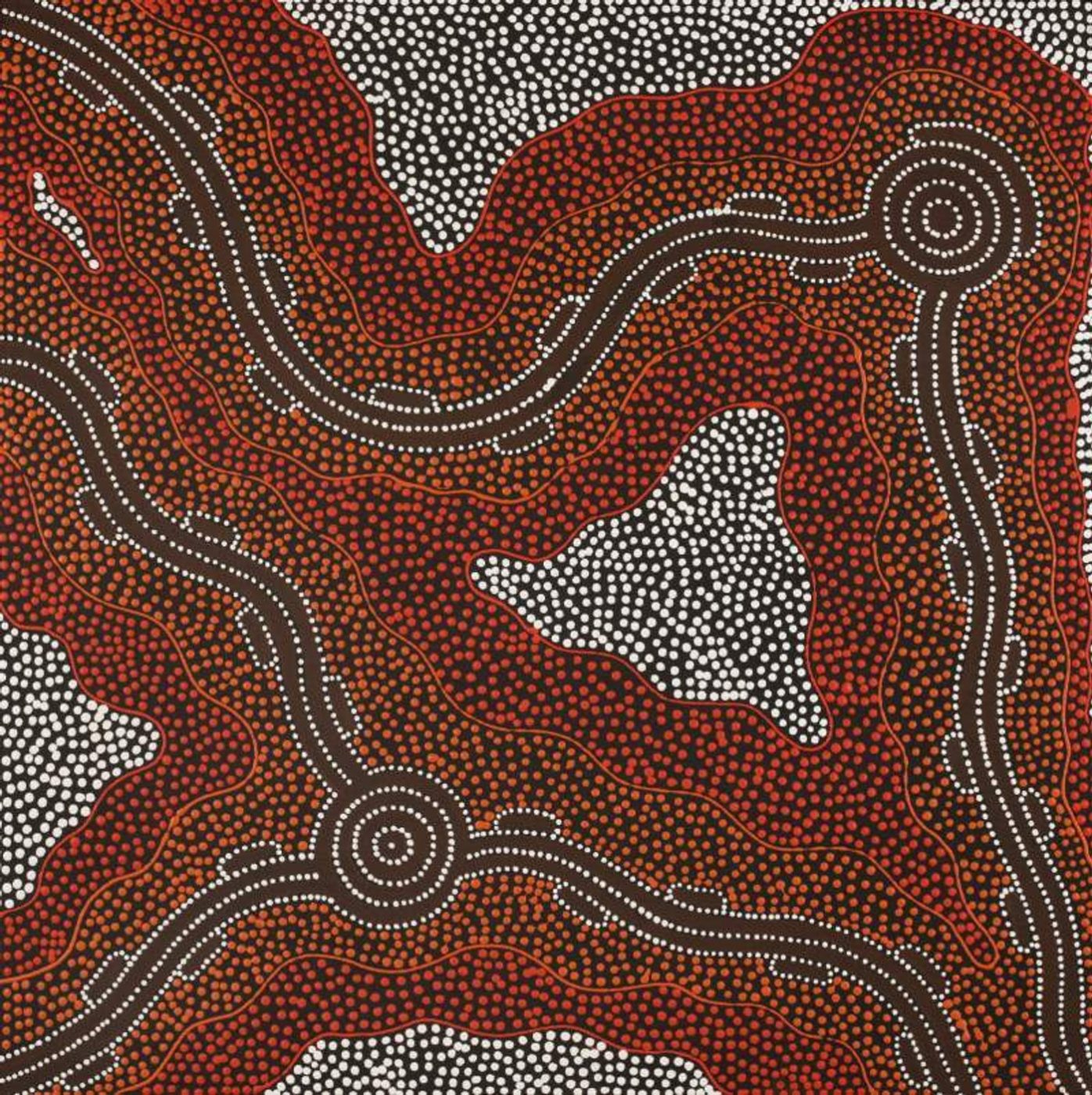 The Yarla Jukurrpa (bush potato [Ipomea costata] Dreaming) tells the story of a fight between ‘yarla’ from Yumurrpa and ‘wapirti’ (bush carrot [Vigna lanceolata]) from Wapurtali. The ‘yarla’ were Jakamarra/Jupurrurla skins and they were in conflict over Napaljarri/Napanangka women, who have the right skin for marriage. The fight took place at ‘Ngardirpi. Many men died, their bodies are now sand hills and their blood formed a water soak. ‘Yarla’ are fibrous tubers that grow beneath a low spreading plant, found by looking for cracks in the ground. Yarla are good to eat, when cooked they are really soft and tasty. This Dreaming belongs to Jupurrurla/Jakamarra men and Napurrula/Nakamarra women. Nakamarra and Napurrula ‘karnta’ (women) are shown sitting down at Yumurrpa gathering ‘yarla’ with ‘karlangu’ (digging sticks) and placing them in ‘parraja’ (wooden carrying dishes). In contemporary Warlpiri paintings traditional iconography is used to represent the Jukurrpa, associated sites and other elements. In paintings of this Jukurrpa women are usually depicted by ‘U’ shapes while the ‘yarla’ plants are represented by concentric circles. The ‘watarlapi’ (the lateral ‘yarla’ roots) are shown across the painting, to symbolize the way this Jukurrpa is spread through Warlpiri country.