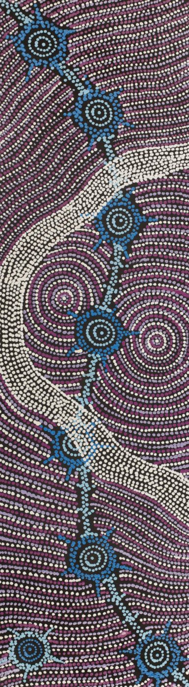 The Napaljarri-warnu Jukurrpa (seven sisters Dreaming) depicts the story of the seven ancestral Napaljarri sisters who are found in the night sky today in the cluster of seven stars in the constellation Taurus, more commonly known as the Pleiades. The Pleiades are seven women of the Napaljarri skin group and are often depicted in paintings of this Jukurrpa carrying the Jampijinpa man ‘wardilyka’ (the bush turkey [Ardeotis australias]) who is in love with the Napaljarri-warnu and who represents the Orion’s Belt cluster of stars. Jukurra-jukurra, the morning star, is a Jakamarra man who is also in love with the seven Napaljarri sisters and is often shown chasing them across the night sky. In a final attempt to escape from the Jakamarra the Napaljarri-warnu turned themselves into fire and ascended to the heavens to become stars. The custodians of the Napaljarri-warnu Jukurrpa are Japaljarri/Jungarrayi men and Napaljarri/Nungarrayi women. Some parts of the Napaljarri-warnu Jukurrpa are closely associated with men’s sacred ceremonies of a very secretive nature. In contemporary Warlpiri paintings traditional iconography is used to represent the Jukurrpa, associated sites and other elements. Often depicted in paintings for this Jukurrpa is the female star Yantarlarangi (Venus – the Evening Star) who chases the seven Napaljarri sisters for having stolen the night from her.