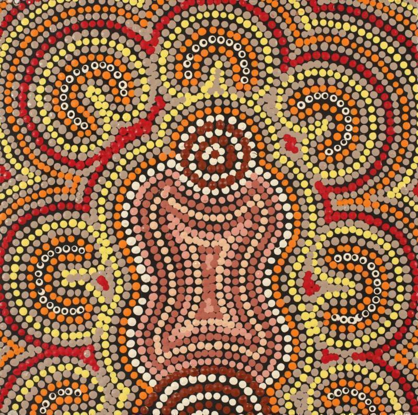 In Warlpiri paintings, traditional iconography is used to represent the Jukurrpa and other elements. Concentric circles are often used to represent the bush foods that the women have collected, while straight lines can be used to depict the ‘karlangu’ (digging sticks). Sinuous lines are often used to represent the ‘ngalyipi’ (snake vine).