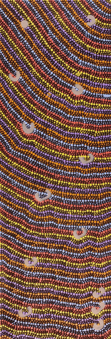 The subject of this work is Lappi Lappi, a rock hole near Lake Hazlett, about 90 km northwest of Lake Mackay in Western Australia. The country belongs to Nampijinpa/Jampijinpa and Nangala/Jangala skin groups. Located in a sheltered basin, the rock hole at Lappi Lappi is a permanent source of water, and is surrounded by country rich in bush tucker. In the time of the Jukurrpa (Dreamtime) many mothers with young children would gather there because it was a safe place to stay. The rock hole at Lappi Lappi is home to a ‘warnayarra’, a rainbow serpent that travels underground between various rock holes. One day, women were gathered at the rock hole with their children, singing and dancing. When the ‘warnayarra’ heard the sound of voices, it travelled silently towards them, under the water. When it reached the edge of the rock hole, it rose out of the water and ate them all.