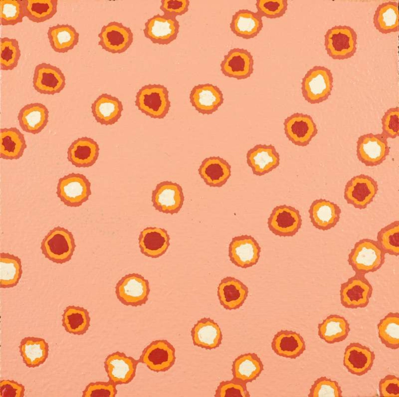 The ‘kirda’ (owners) of this country are Napangardi/Napanangka women and Japangardi/Japanangka men, who can depict portions of the Mina Mina Jukurrpa in their paintings. There are a number of different components of the Mina Mina Jukurrpa; artists usually choose to depict one particular aspect. These can include ‘karnta’ (women), ‘karlangu’ (digging sticks), ‘majardi’ (hairstring skirts/tassels), ‘ngalyipi’ (snakevine [Tinospora smilacina]), ‘jintiparnta’ (desert truffle [Elderia arenivaga]), and ‘kurrkara’ (desert oak [Allocasuarina decaisneana]).