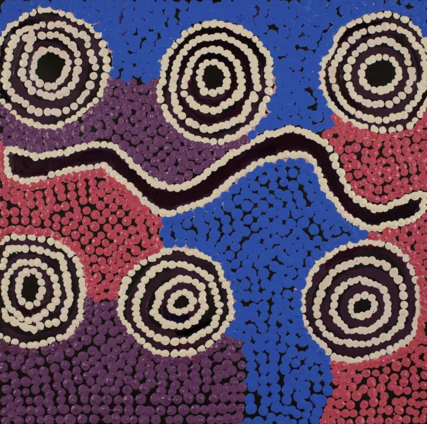 The subject of this work is Lappi Lappi, a rock hole near Lake Hazlett, about 90 km northwest of Lake Mackay in Western Australia. The country belongs to Nampijinpa/Jampijinpa and Nangala/Jangala skin groups. Located in a sheltered basin, the rock hole at Lappi Lappi is a permanent source of water, and is surrounded by country rich in bush tucker. In the time of the Jukurrpa (Dreamtime) many mothers with young children would gather there because it was a safe place to stay. The rock hole at Lappi Lappi is home to a ‘warnayarra’, a rainbow serpent that travels underground between various rock holes. One day, women were gathered at the rock hole with their children, singing and dancing. When the ‘warnayarra’ heard the sound of voices, it travelled silently towards them, under the water. When it reached the edge of the rock hole, it rose out of the water and ate them all.