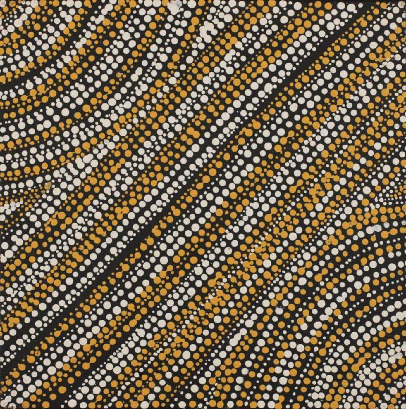 The ‘kirda’ (owners) of this country are Napangardi/Napanangka women and Japangardi/Japanangka men, who can depict portions of the Mina Mina Jukurrpa in their paintings. There are a number of different components of the Mina Mina Jukurrpa; artists usually choose to depict one particular aspect. These can include ‘karnta’ (women), ‘karlangu’ (digging sticks), ‘majardi’ (hairstring skirts/tassels), ‘ngalyipi’ (snakevine [Tinospora smilacina]), ‘jintiparnta’ (desert truffle [Elderia arenivaga]), and ‘kurrkara’ (desert oak [Allocasuarina decaisneana]).