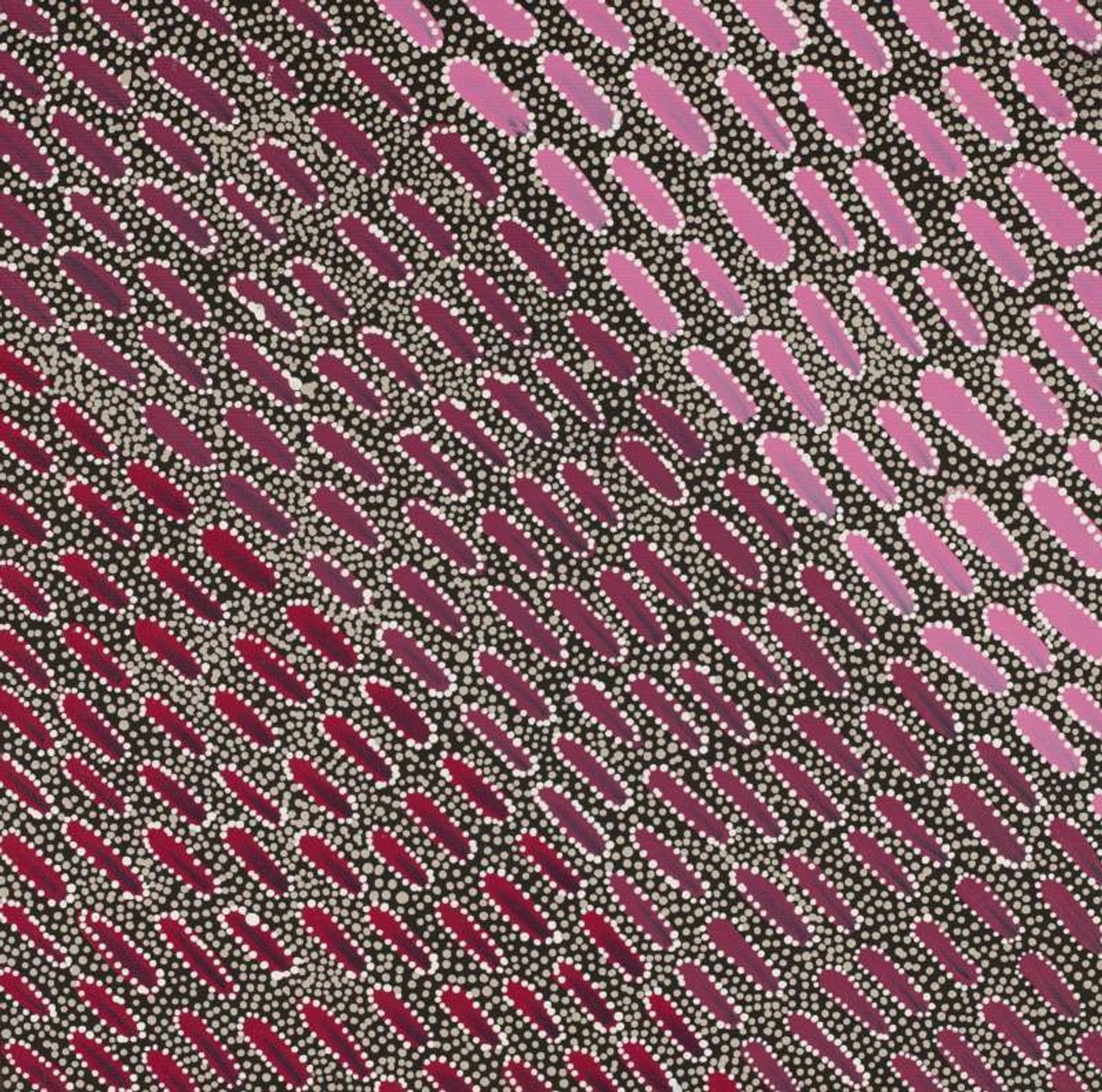 The site depicted in this painting is Puyurru, west of Yuendumu. In the usually dry creek beds are ‘mulju’ (soakages), or naturally occurring wells. The ‘kirda’ (owners) for this site are Nangala/Nampijinpa women and Jangala/Jampijinpa men. Two Jangala men, rainmakers, sang the rain, unleashing a giant storm. The storm travelled across the country from the east to the west, initially travelling with a ‘pamapardu Jukurrpa’ (termite Dreaming) from Warntungurru to Warlura, a waterhole 8 miles east of Yuendumu. At Warlura, a gecko called Yumariyumari blew the storm on to Lapurrukurra and Wilpiri. Bolts of lightning shot out at Wirnpa (also called Mardinymardinypa) and at Kanaralji. At this point the Dreaming track also includes the ‘kurdukurdu mangkurdu Jukurrpa’ (children of the clouds Dreaming). The water Dreaming built hills at Ngamangama using baby clouds and also stuck long pointy clouds into the ground at Jukajuka, where they can still be seen today as rock formations.