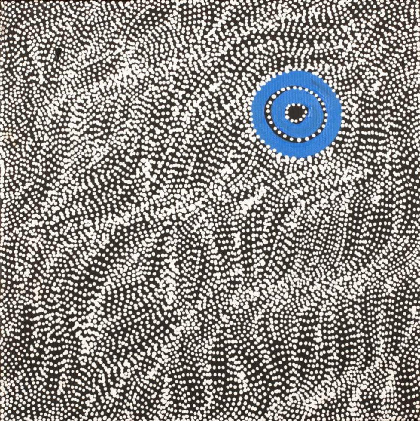Yanjirlpirri Jukurrpa (Star Dreaming) tells of the journey of Japaljarri and Jungarrayi men who travelled from Kurlurngalinypa (near Lajamanu) to Yanjirlypirri (west of Yuendumu) and then on to Lake Mackay on the West Australian border. Along the way they performed ‘kurdiji’ (initiation ceremonies) for young men. Women also danced for the ‘kurdiji’. The site depicted in this canvas is Yanjirlypiri (star) where there is a low hill and a water soakage. The importance of this place cannot be overemphasized as young boys are brought here to be initiated from as far as Pitjanjatjara country to the south and Lajamanu to the north.