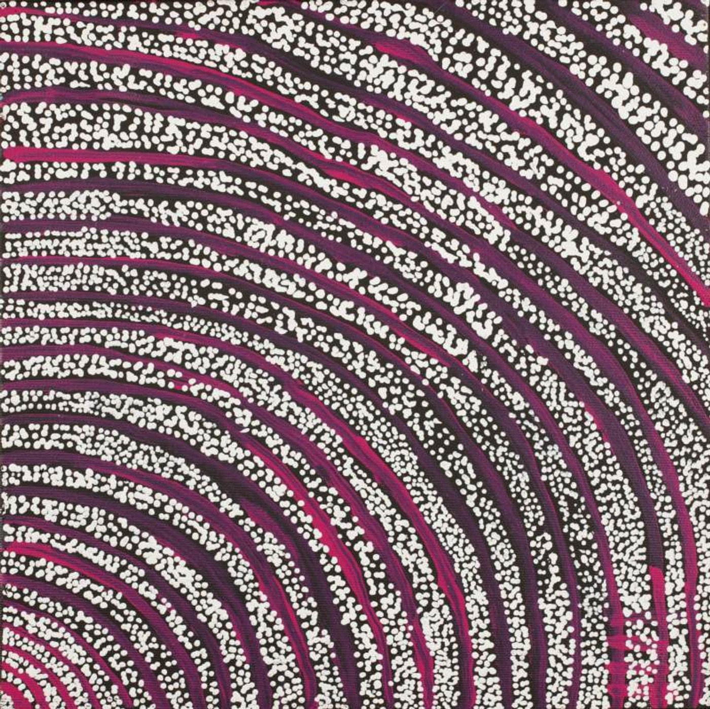 The Wanakiji Jukurrpa (bush tomato [Solanum chippendalei] Dreaming) travels through Yaturlu (near Mount Theo, north of Yuendumu). “Wanakiji” grows in open spinifex country and is a small, prickly plant with purple flowers that bears green fleshy fruit with many small black seeds. After collecting the fruit the seeds are removed with a small wooden spoon called ‘kajalarra’. The fruit then can be eaten raw or threaded onto skewers called ‘turlturrpa’ and then cooked over a fire. ‘Wanakiji’ can also be skewered and left to dry. When they are prepared in this way it is called ‘turlturrpa’ and the fruit can be kept for a long time. In contemporary Warlpiri paintings traditional iconography is used to represent the Jukurrpa, particular sites and other elements. The Wanakiji Jukurrpa belongs to Napanangka/Napangardi women and Japanangka/Japangardi men.
